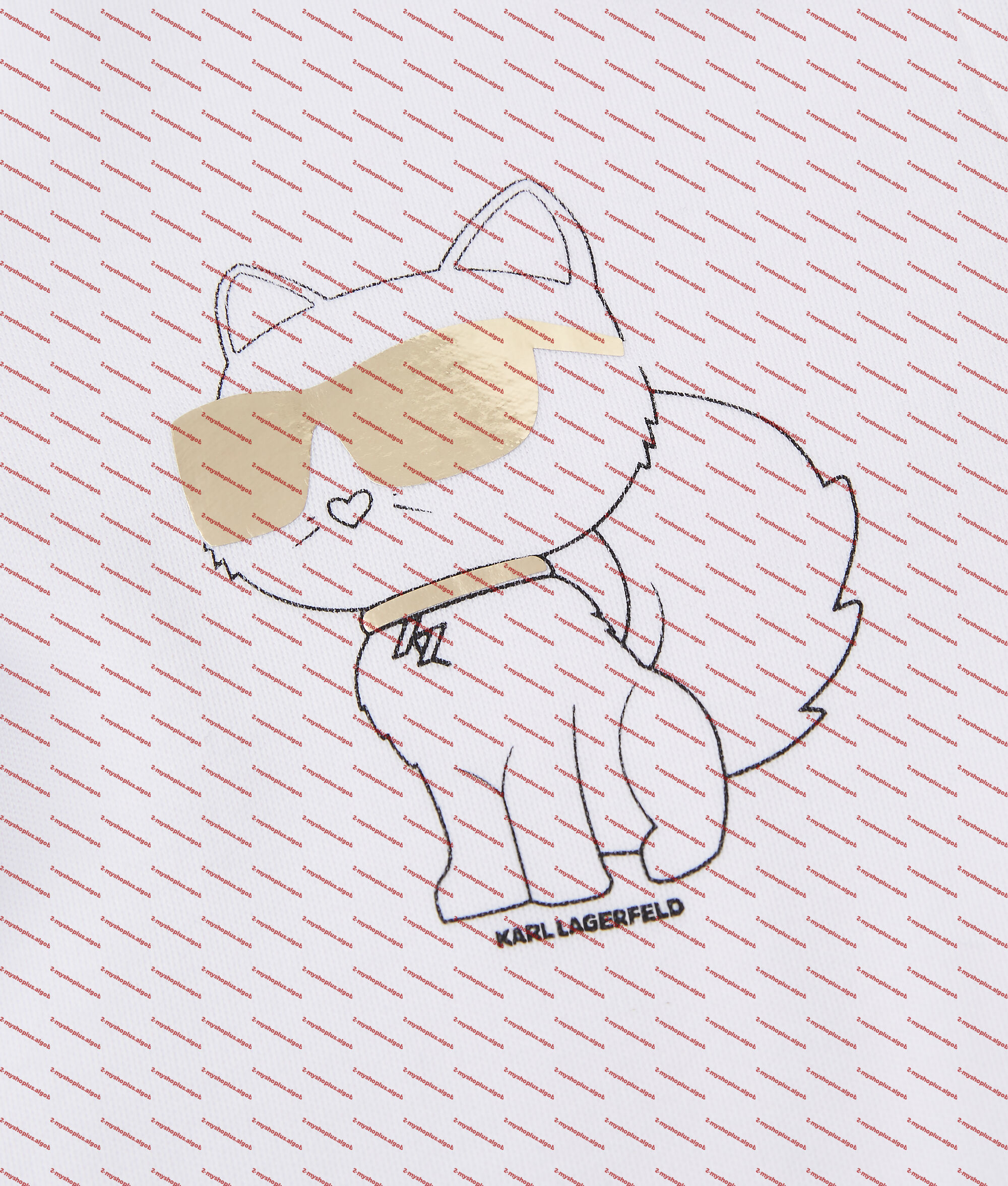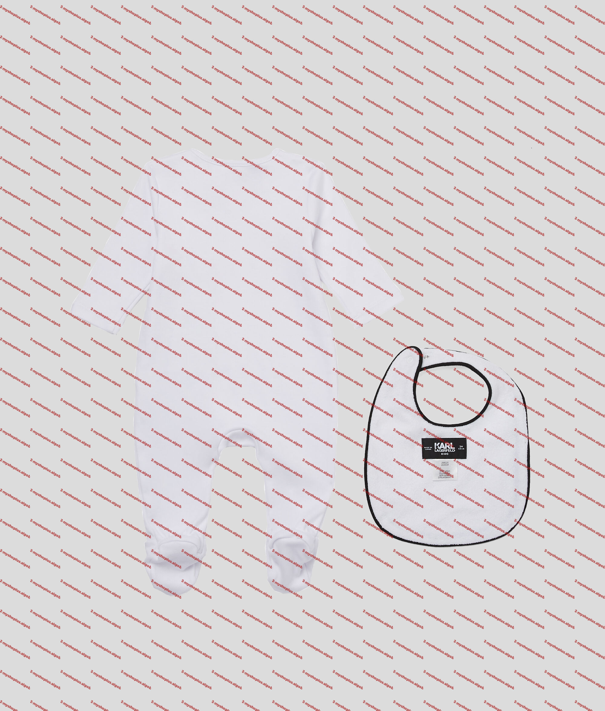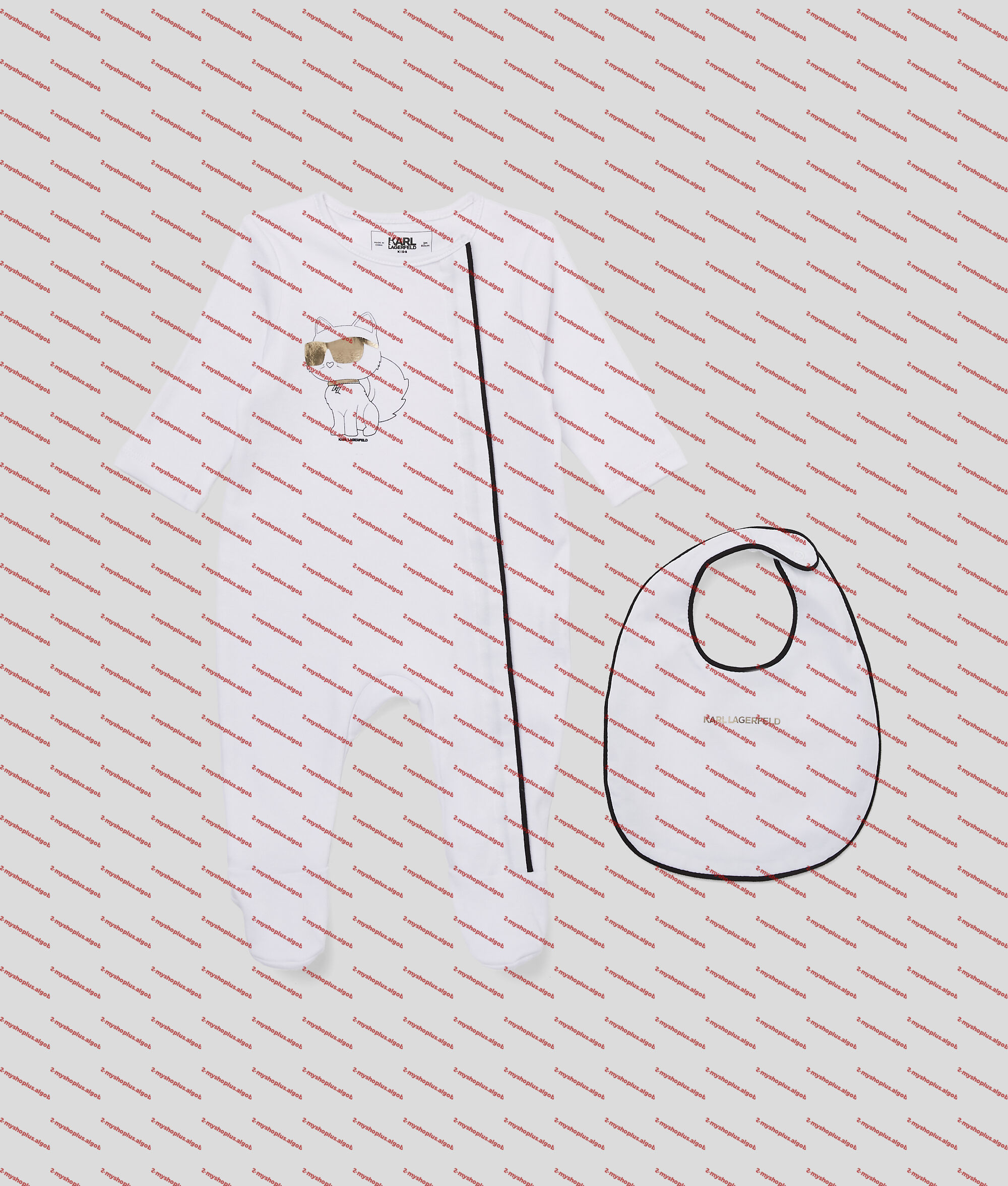 Cet ensemble composé d'un pyjama et d'un bavoir assorti est orné d'un liseré contrastant et arbore un grand motif Choupette sur le devant.