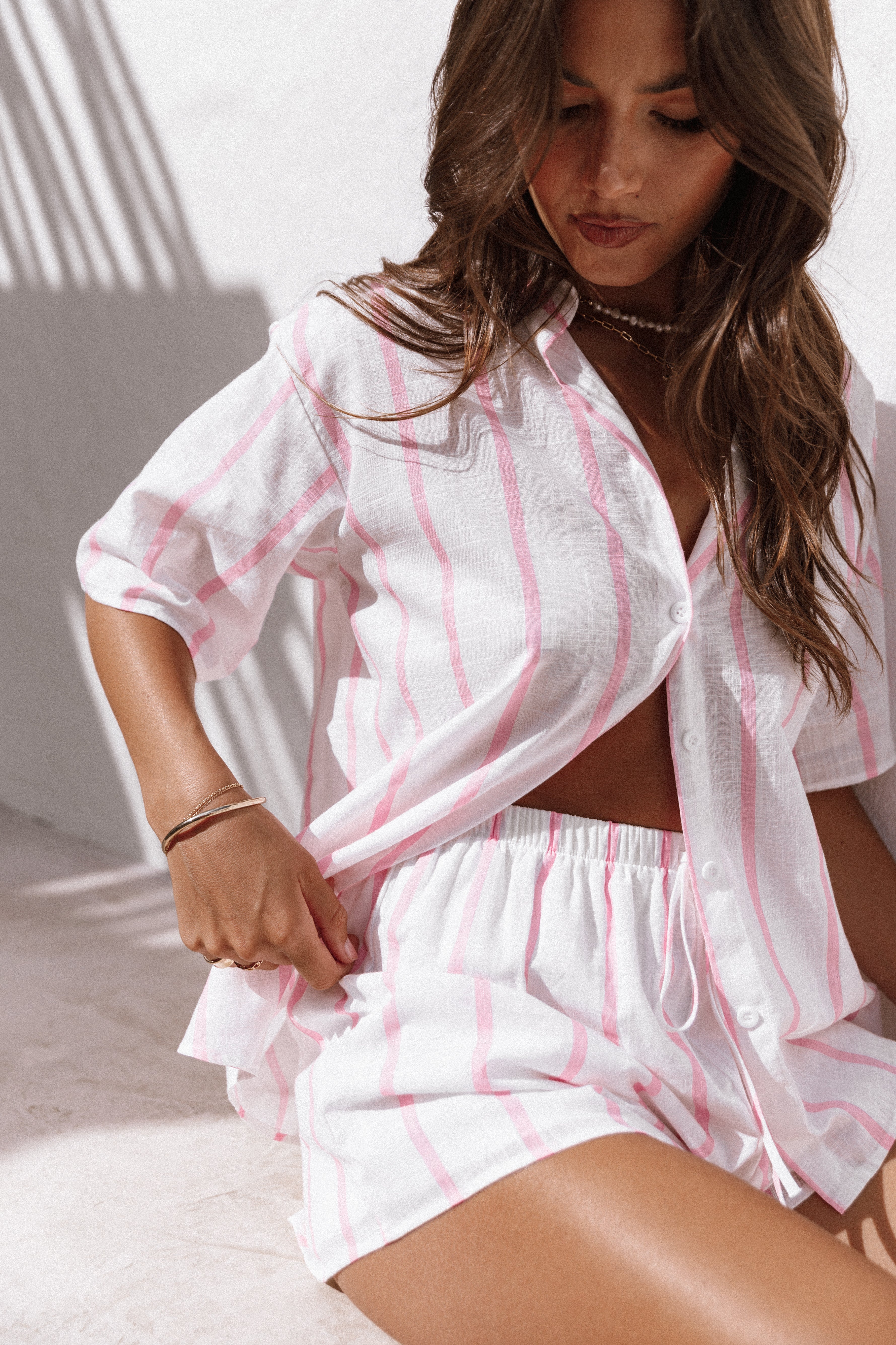 Say hello to summer with this fun top and shorts set! This two-piece ensemble features a spread collar, V neckline, short sleeves, and front functional button close. The high waisted style shorts come with an elasticised waistband and non functional tie detail for added charm.