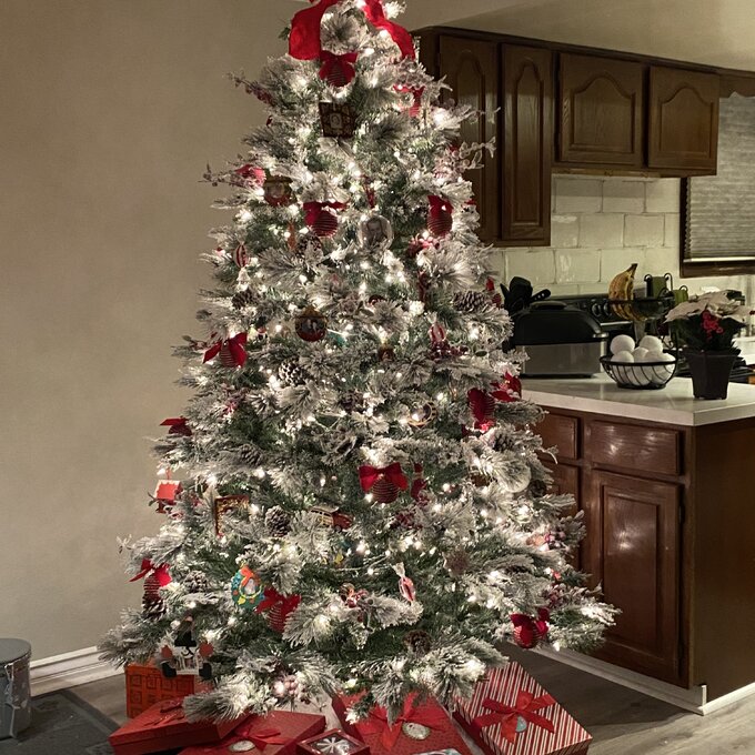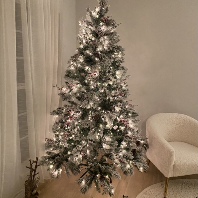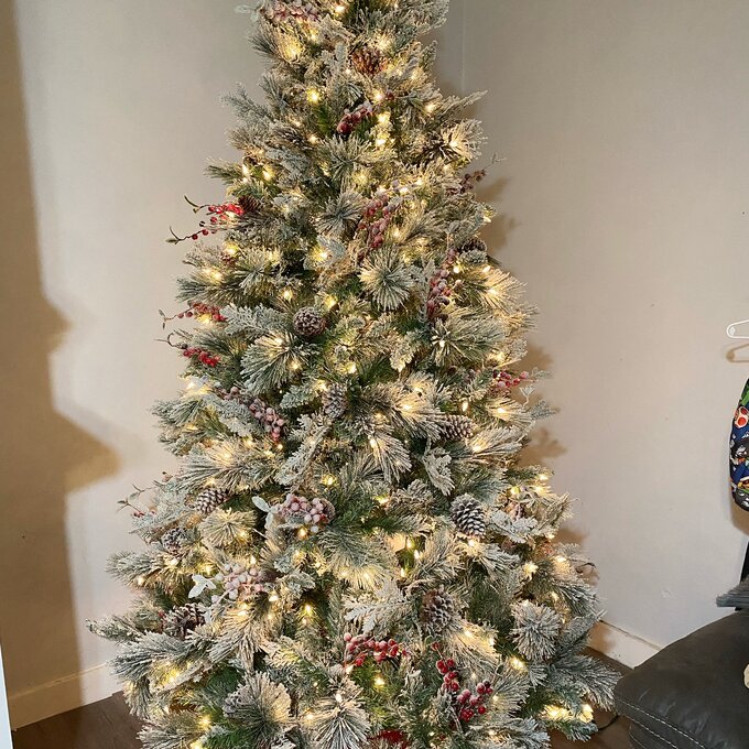 This is the season to be jolly, not to be sweeping up pine needles! Leave your floors needle-free by decking the halls with this festive Christmas tree. Sitting atop a foldable metal stand to keep it standing tall, it features lush PVC pine branches that stay evergreen all year long without ever needing to be watered. A festive white frost adorns each branch, giving it a snowy look, while cheery red holly berries and frosted pine cones add a rustic and natural look to your space. Arriving pre-lit clear white lights, this tree gets you and your family in the holiday spirit.
