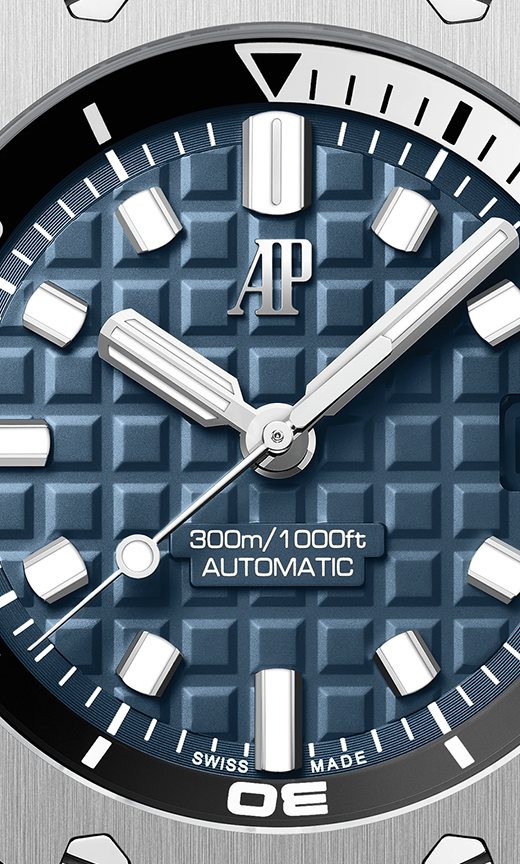 Blue dial with “Méga Tapisserie” pattern, white gold applied hour-markers and Royal Oak hands with luminescent coating, black rotating inner bezel with zone from 60 to 15 minutes in white
