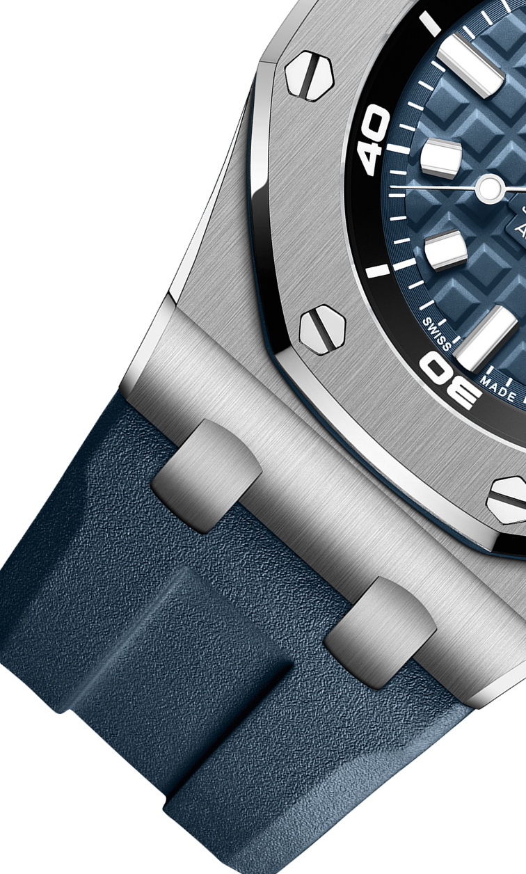 Blue dial with “Méga Tapisserie” pattern, white gold applied hour-markers and Royal Oak hands with luminescent coating, black rotating inner bezel with zone from 60 to 15 minutes in white