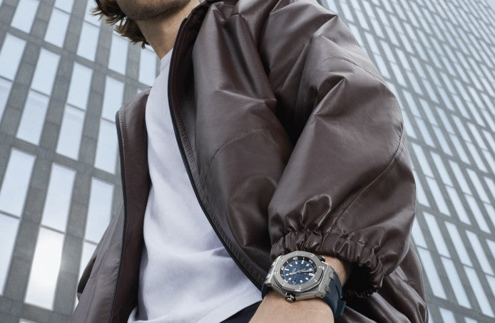Blue dial with “Méga Tapisserie” pattern, white gold applied hour-markers and Royal Oak hands with luminescent coating, black rotating inner bezel with zone from 60 to 15 minutes in white
