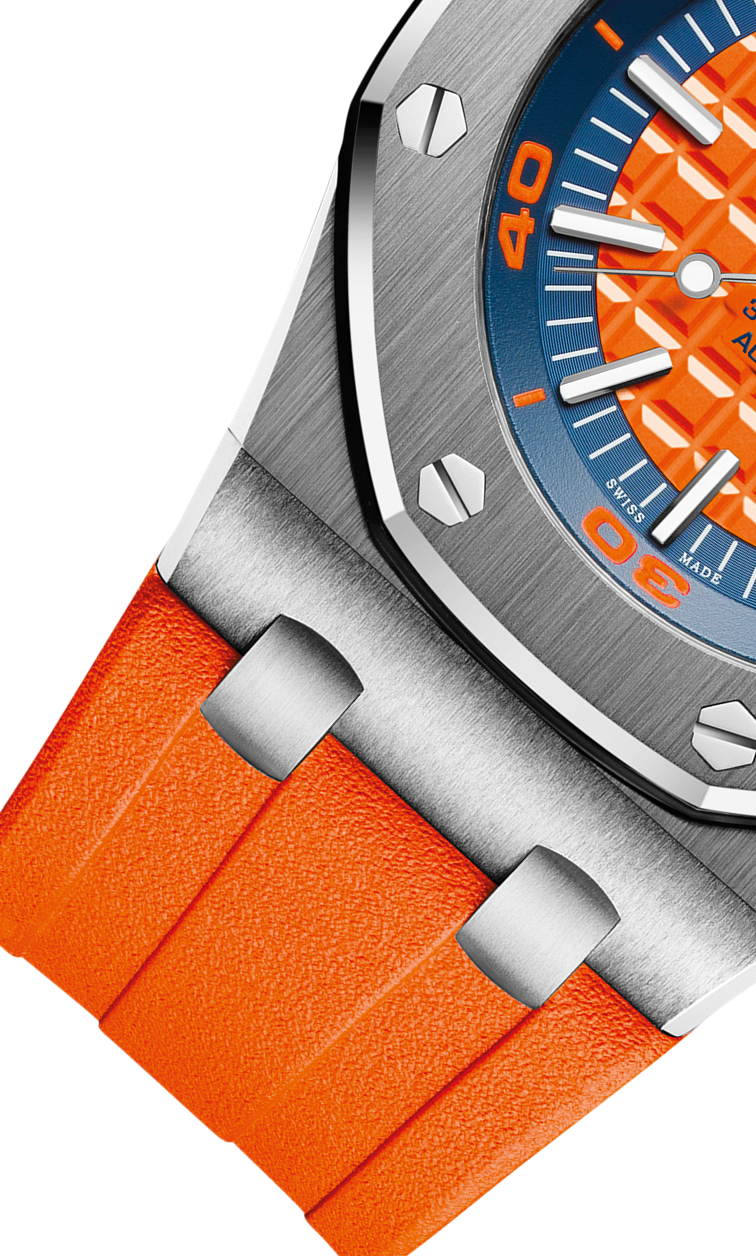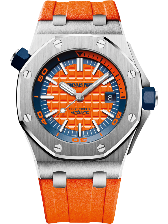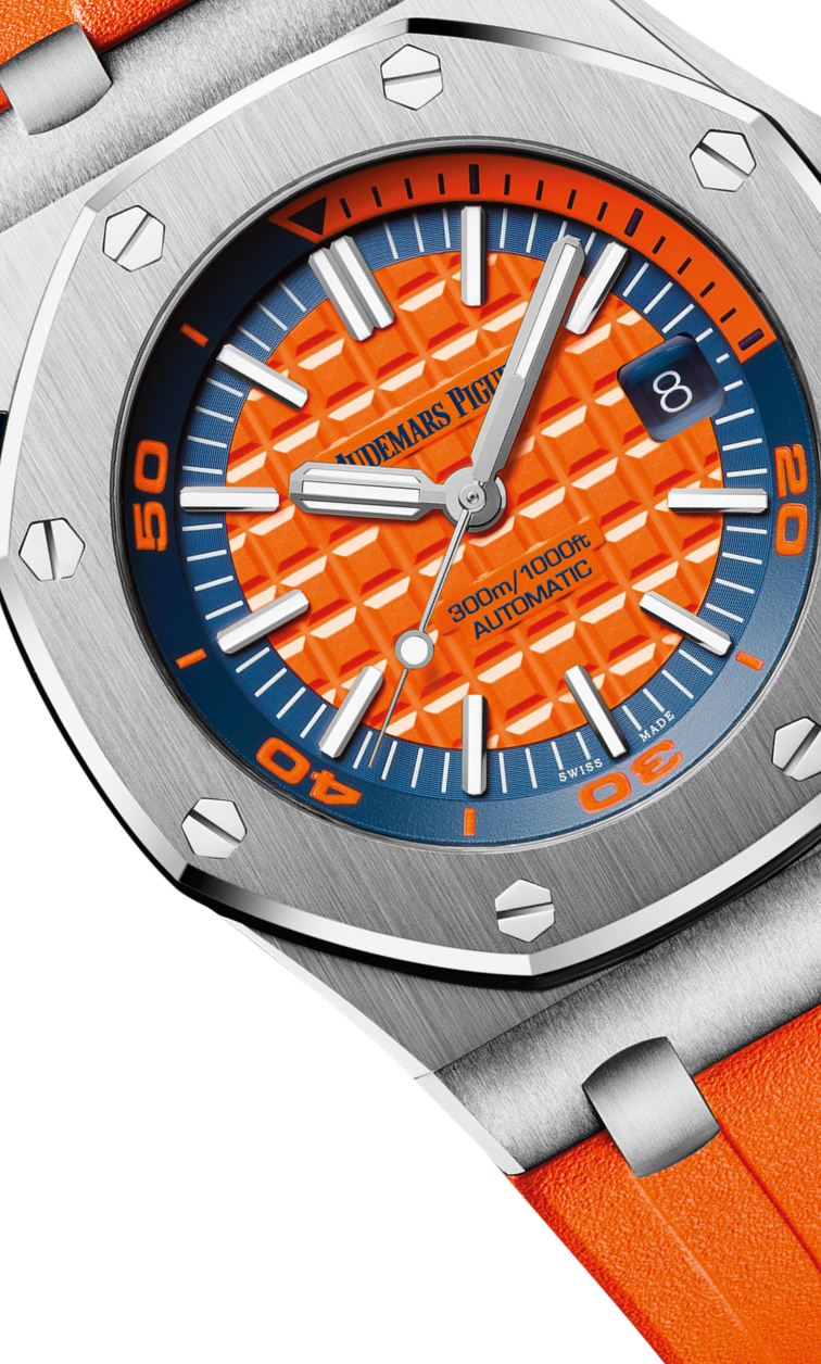 Orange dial with “Méga Tapisserie” pattern, white gold applied hour-markers and Royal Oak hands with luminescent coating, blue rotating inner bezel with diving scale and zone from 60 to 15 minutes in orange