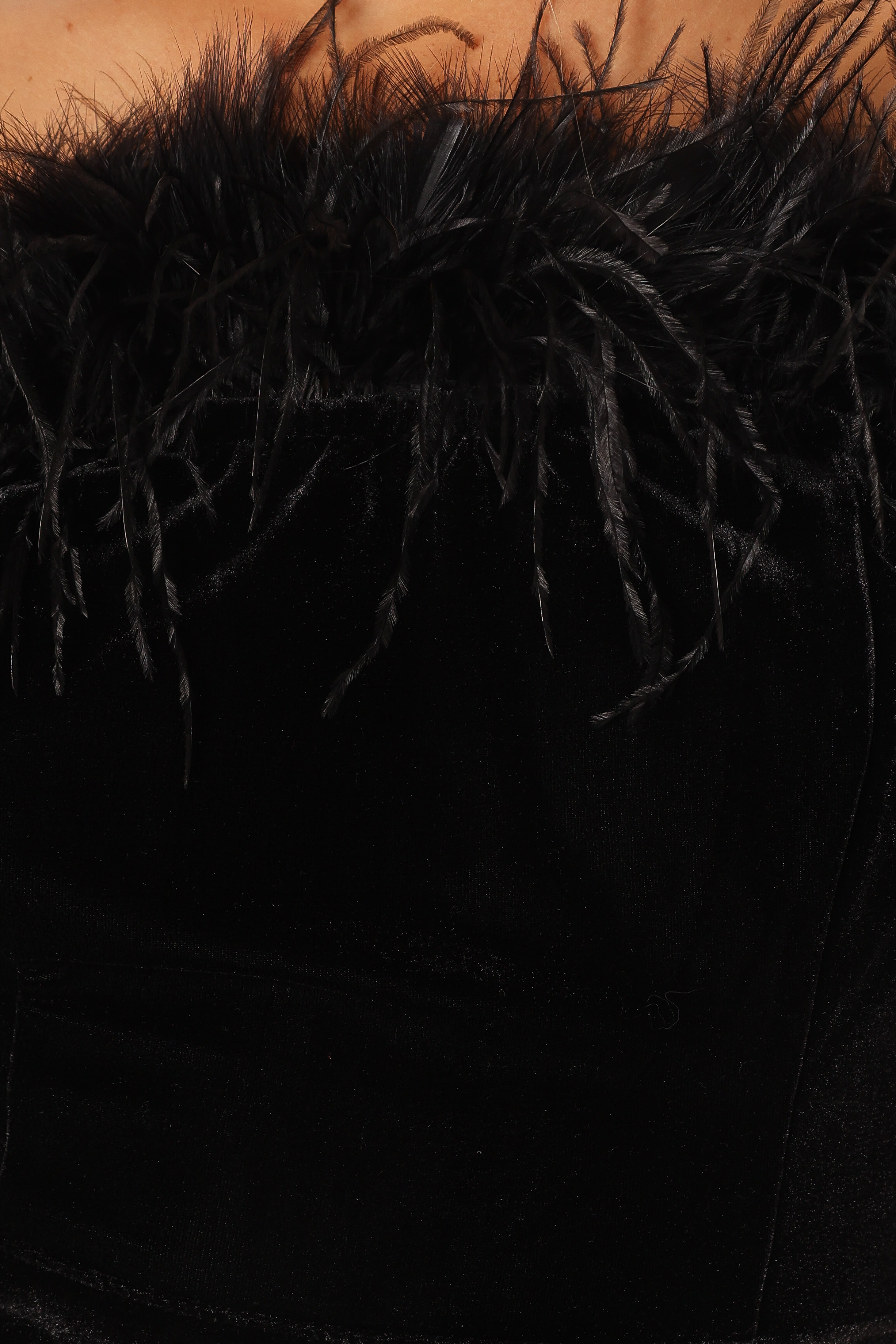DETAILS Featuring a straight neckline with delicate feather trim detailing and a strapless design, this jumpsuit exudes elegance and sophistication. The back invisible zip with hook and clasp adds to the sleek and seamless look of this piece, while also making it easy to slip into.