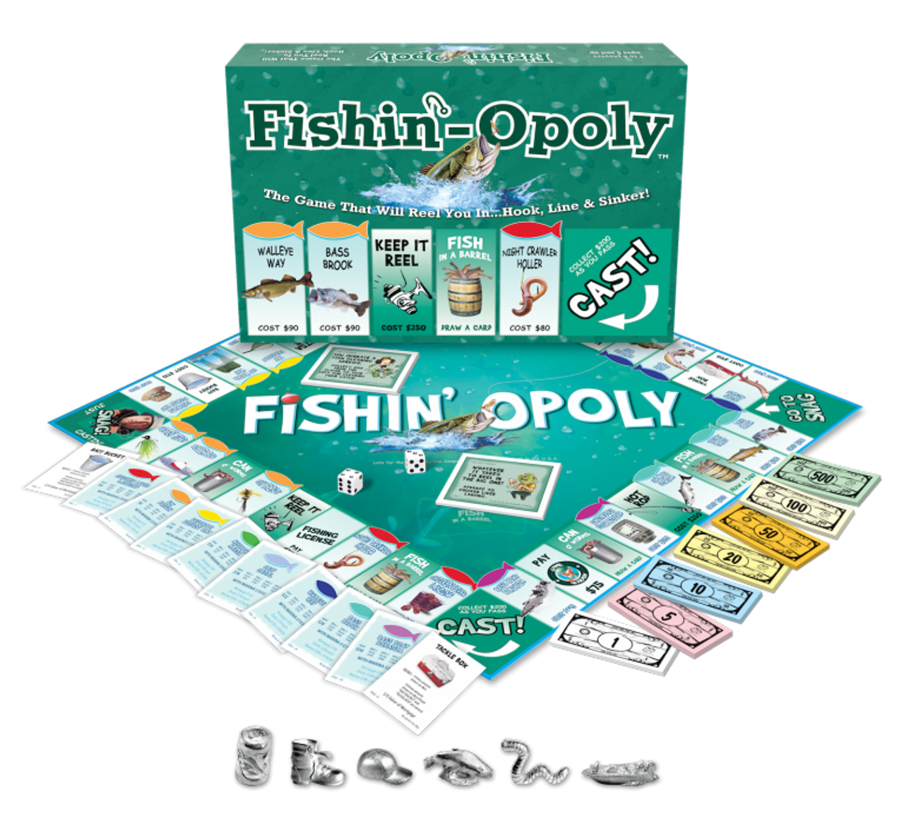 Fishin’-opoly allows players to buy, sell and trade their favorite fish and gear with family and friends. Players choose their tokens and advance to Cast. It’s all fun and games until someone lands on SNAG, gets all hung up,and is out of the game for three turns! While playing, flip over the deeds and learn some fun fishin’ facts.