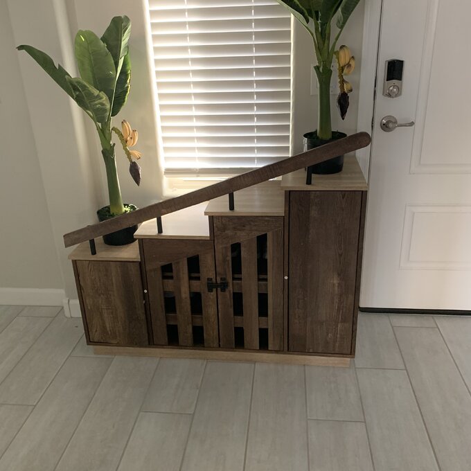 Fun and functional, these shoe storage cabinets house your favorite footwear in style! Crafted from engineered wood, this cabinet strikes a stepped silhouette topped with a decorative railing. Featuring planked construction, it also showcases four doors that open to reveal shelved storage for up to twelve pairs of shoes. Plus, the stepped top provides display space for everything from framed photos to potted plants.