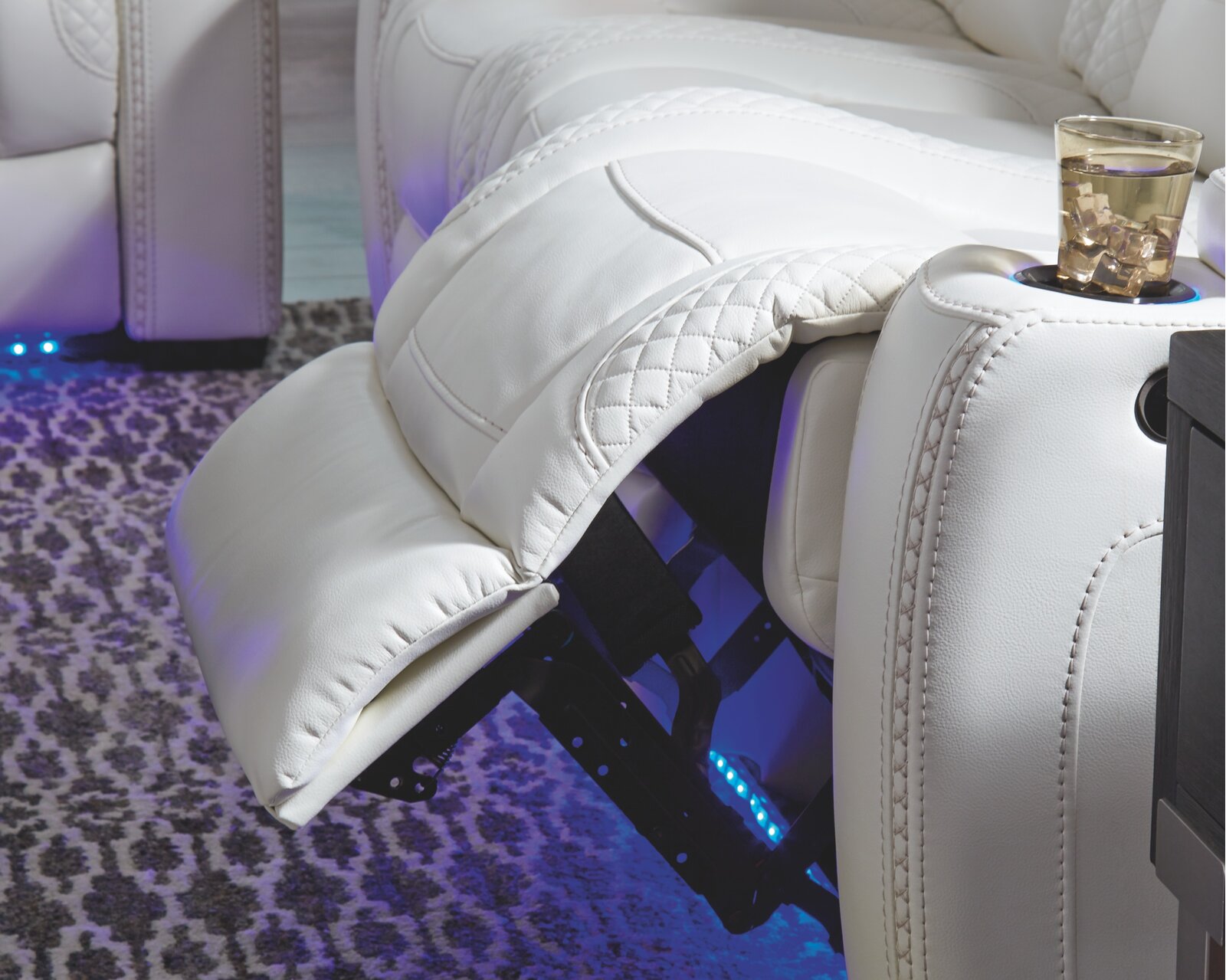 This 3-seat power recliner makes you feel like you’re in a luxury theater. It features a metal frame with sinuous spring construction, foam cushioning, and tailored white faux leather upholstery with crosshatch accents. Sit back and enjoy this theater sofa’s push-button reclining outer bucket seats, power adjustable headrests, and LED accent lighting. And bonus: the center seat folds down into a table, featuring dual-side cup holders, three built-in USB ports, and a pouch for your reading material. Movie night’s definitely at your place.