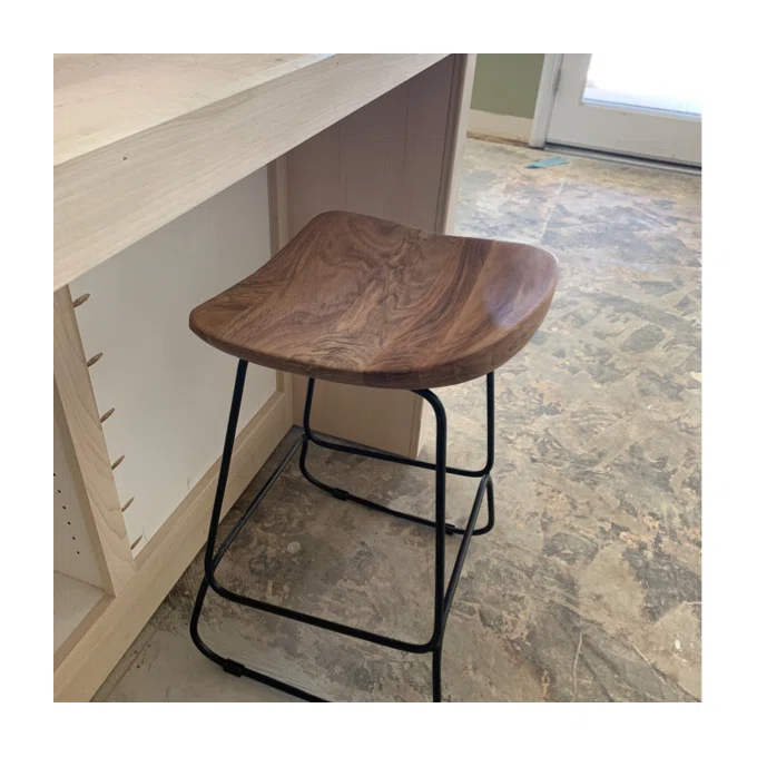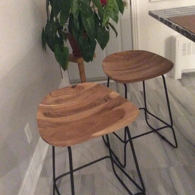 This 5-piece dining set creates a rugged and minimal place to enjoy a casual Sunday brunch or weeknight dinner. It includes four 24" tall counter stools and a counter-height table. Each piece is made from solid acacia wood with a warm finish that highlights the natural grain, and they're built on a black metal base. The tabletop and backless seats boast an irregular wooden design with a live edge for an earthy and rugged look. Sleek, sled-style legs on the stools have a built-in support bar that keep your feet comfy while you sit. Plus, the table showcases hairpin legs for plenty of clean-lined style.