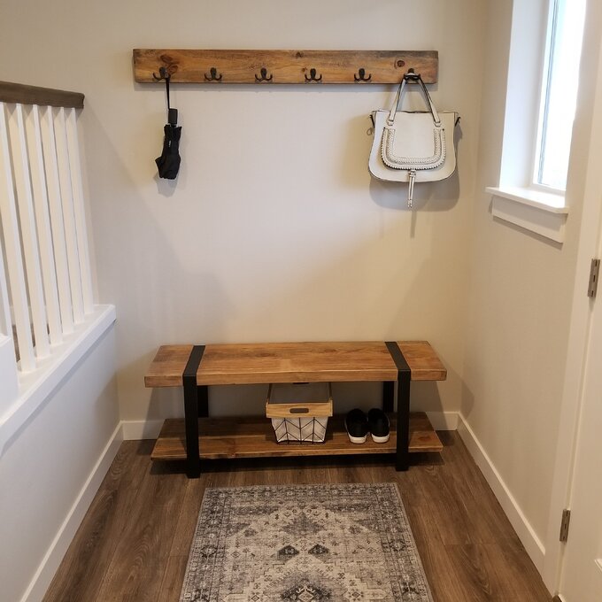 Bring function to the foyer without sacrificing style with this wall-mounted hall tree and storage bench, perfect for organizing out-the-door essentials. Crafted from solid reclaimed birch wood, each rustic design sports a natural brown stain with distressed details that help to highlight its knots, grains, and character. The bench’s open lower shelf lets you keep baskets of blankets, magazine, and more on hand, while six double-prong hooks provide a place to hang jackets and bags. Assembly is required.