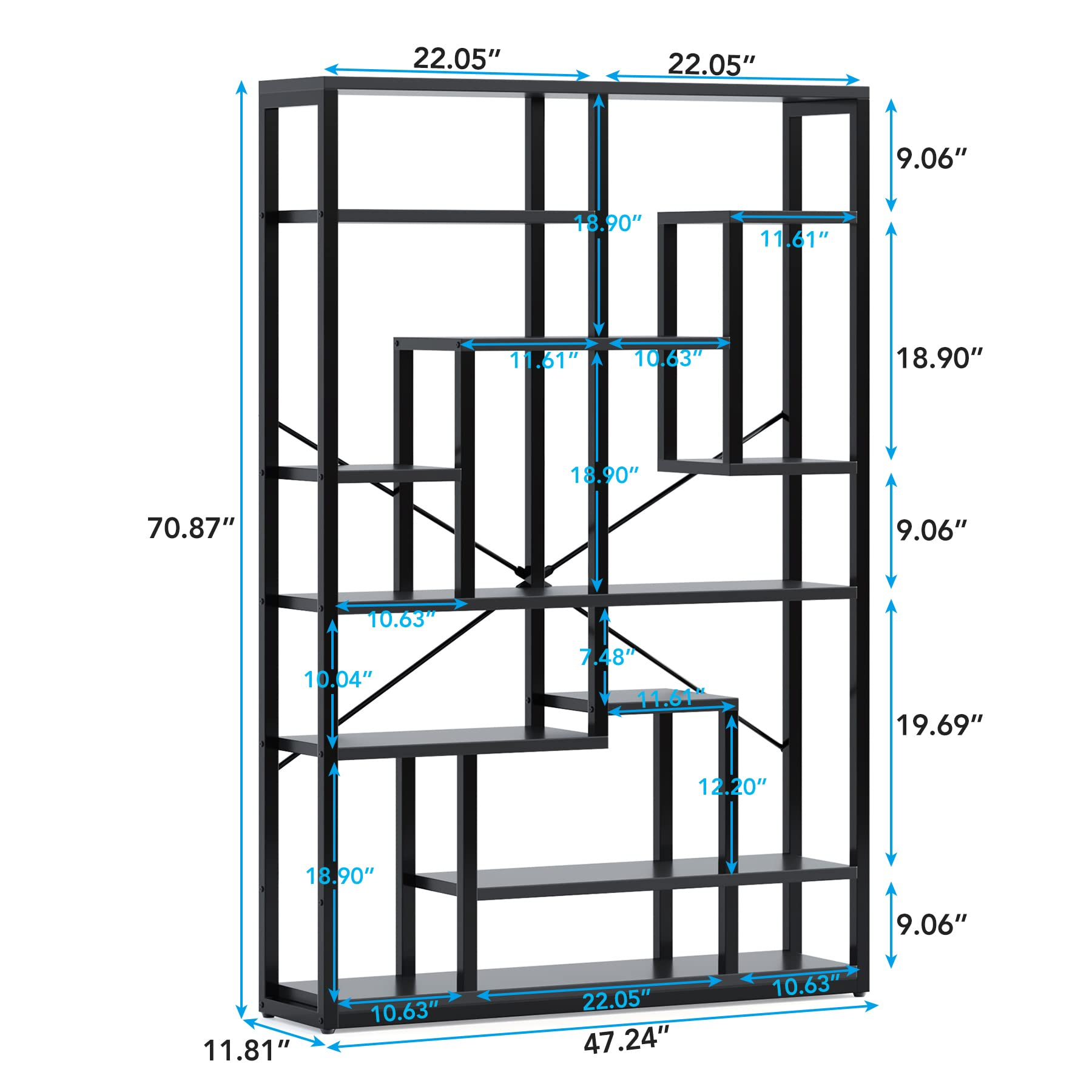 【Furniture】Black Bookshelf 47” Bookcase 9 Tier Tall Book Shelf Rustic Geometric Bookcase Display Shelf Organizer