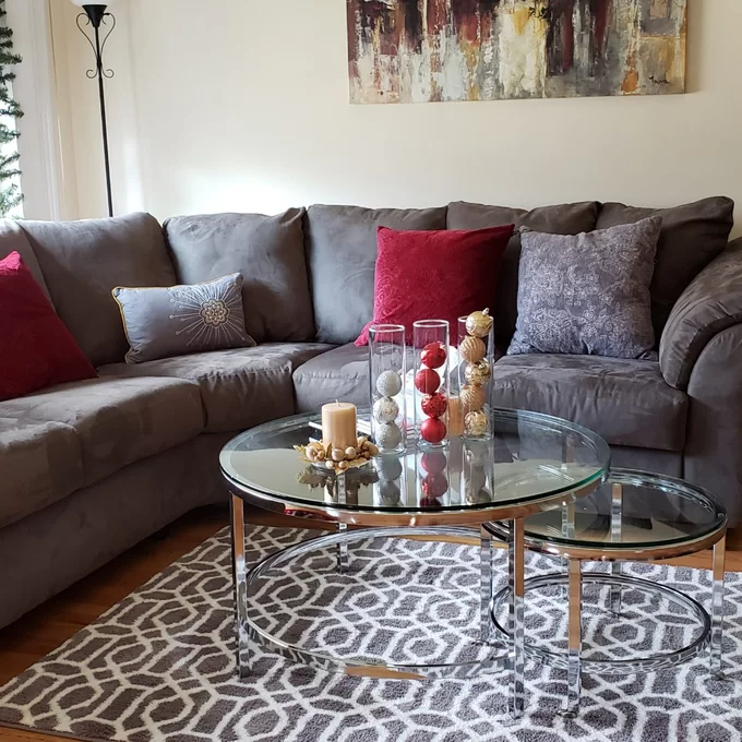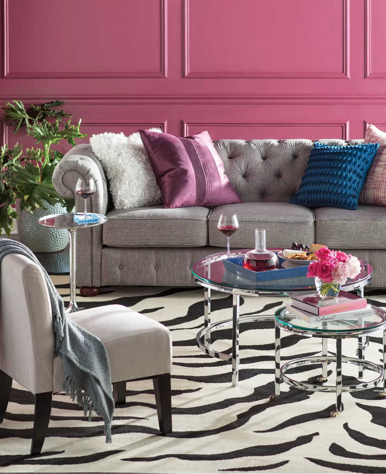 This set of circular nesting tables adds surface and glam style without compromising floor space. It includes two coffee tables both with steel polished chrome bases. The larger table measures 34'' in diameter and the smaller measures 24'' – when you need more floor space, slide the smaller one (with caster wheels) underneath to nest them. We love that the tops are both made from scratch-resistant glass so you get a luxe look with a smooth finish.