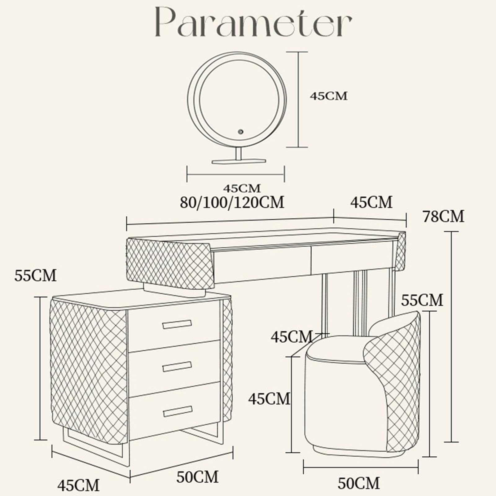 The luxury makeup vanity striking a diamond-tufted leather upholstery, sintered stone top, and stainless steel base develops a luxury and elegant flair to your bedroom. This makeup vanity is also a good present for daughter,for wife and your girlfriend. Women was born to be beauty. This vanity can let it come to reality. The sintered stone top featuring a Mohs scale of mineral hardness of 7 resists knife abrasion and scratches. Wipe the foundation on the table easily with a damp cloth without leaving any stains. Start your day with an intelligent light. Paired with a high-definition mirror with 3 hues: white, natural, and warm, you can get a clear view of your face and hairstyle in different indoor ambiances with a simple nudge.The vanity desk with 5 solid wood drawers keep your lotion, masks, perfumes, foundations, and other beauty supplies out of sight and within arm's reach.