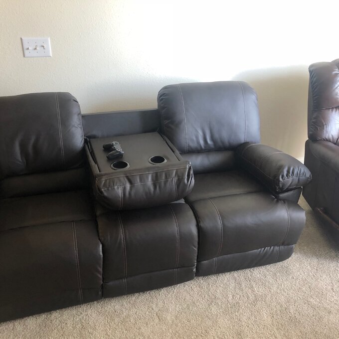 Uniquely appointed for ultimate relaxation, this collection will provide your living room with a comfortable place to spend your downtime. Dark brown bi-cast vinyl covers the plush seating of this motion seating group. The sofa features a unique drop-down back center console and dual reclining ends.
