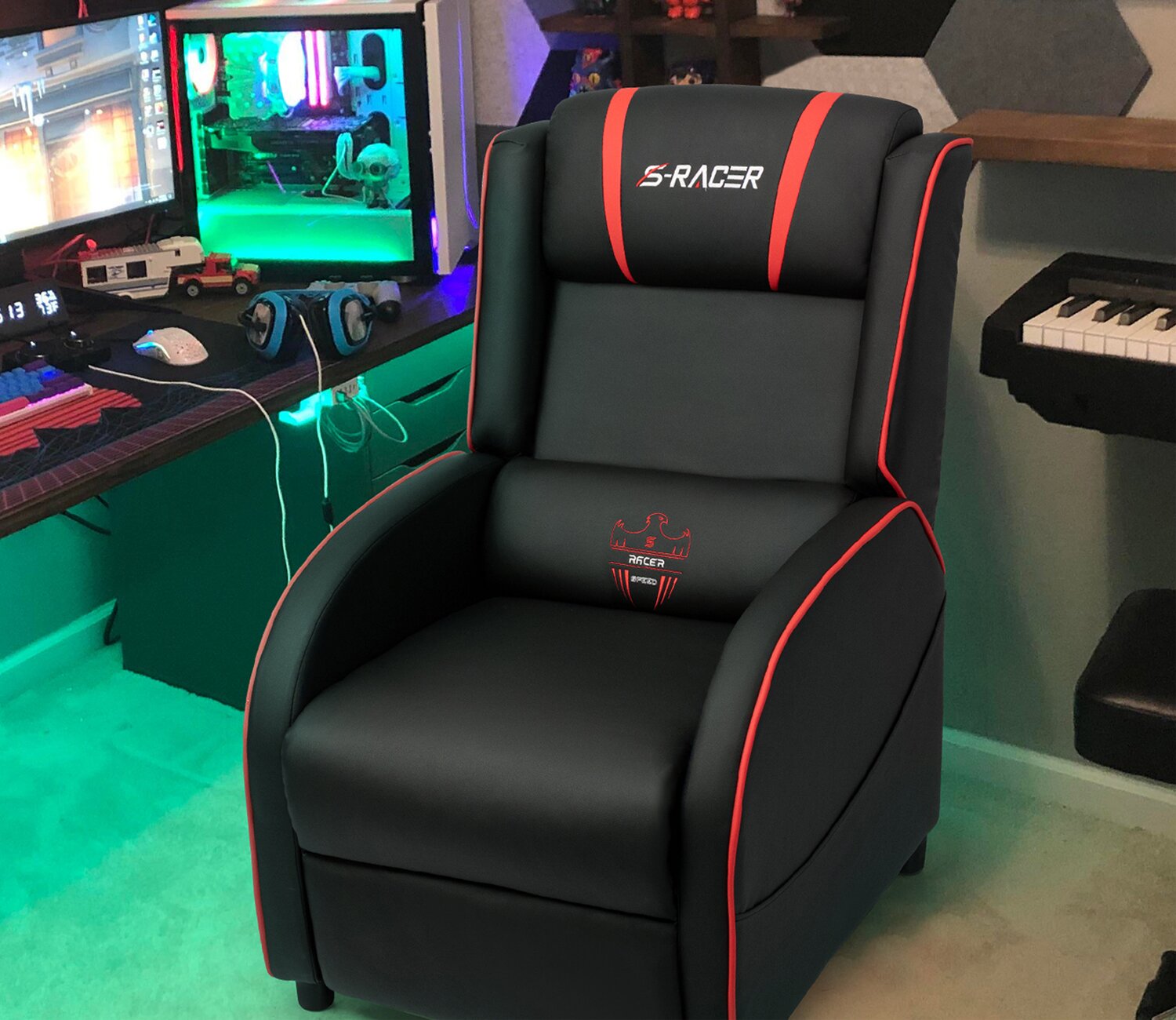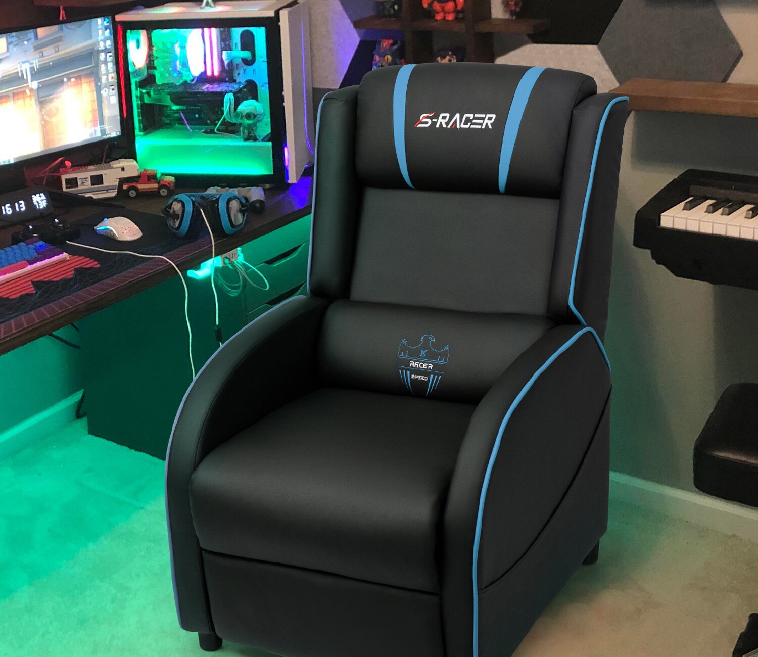 The massage game recliner's main material for high-quality PU leather and thick high-density sponge, with adjustable angle of the backrest and foot pedal, more suitable for a long time playing, working, or rest, providing you a comfortable sitting position experience. Connect the socket and use the remote control to control the massage function.