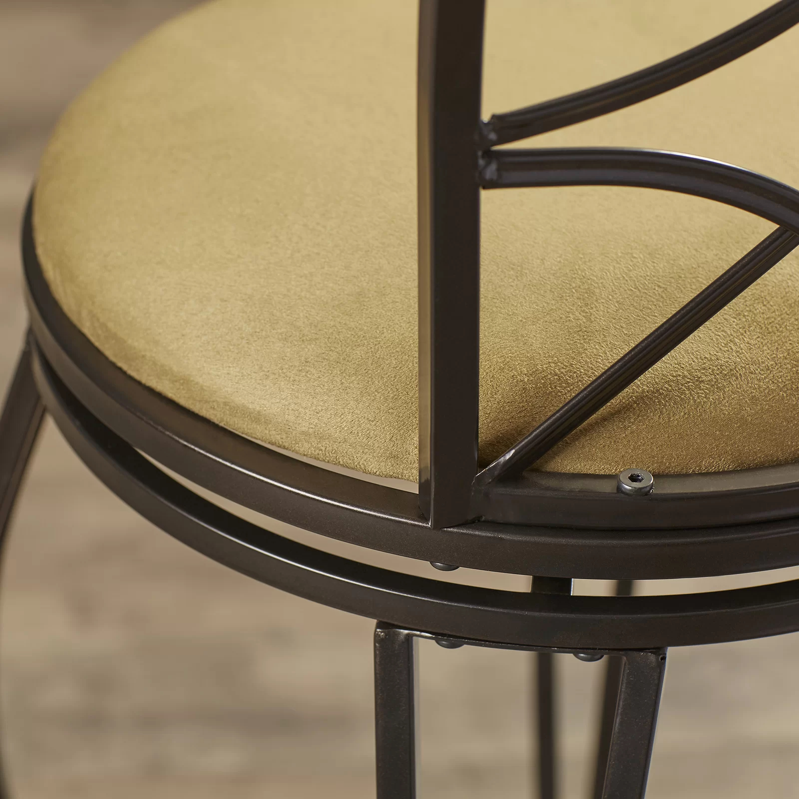 Short on square footage but eager to entertain? This three-piece dining set is the perfect pick for your home! Complete with one compact table with a beveled glass top and two swivel bar stools, this set is crafted from metal in a galaxy bronze finish that blends easily with a variety of color palettes and aesthetics. Brown fabric upholstery cushions each circular seat for a more approachable look, while openwork geometric back accents round out the set with a dash of distinction. Assembly is required.