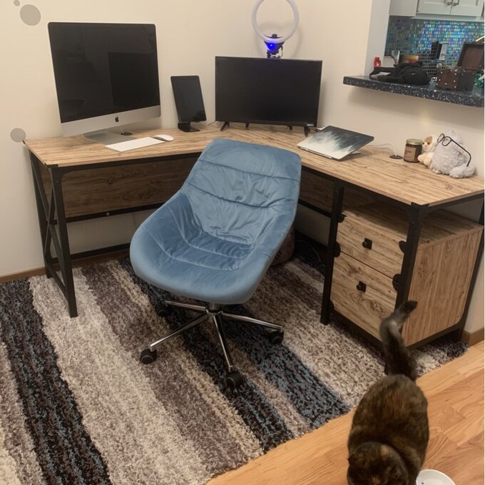 Your office deserves to be stylish too! Update the look of your home office or workspace with the industrial-inspired style and design of this L-shaped desk from the Steel River® collection. This office desk offers a spacious work surface that provides room for all your office must-haves like your laptop, stacks of notepads, writing utensils, and your hot cup of coffee. It even has space for home décor items like an accent lamp and decorative plants. This industrial desk features a small storage drawer that opens and closes on smooth metal runners. It also features a lower drawer with full extension slides that can hold letter-size hanging files so you can keep important papers organized. Its cord management system includes two desktop grommets to keep your cords neat and out of the way. This industrial office desk features a textured, powder-coated metal frame and corner accents. It's finished on all sides so it'll look great from any angle. Finished in Carbon Oak®, this stunning L-shaped desk is just what your home office needs.