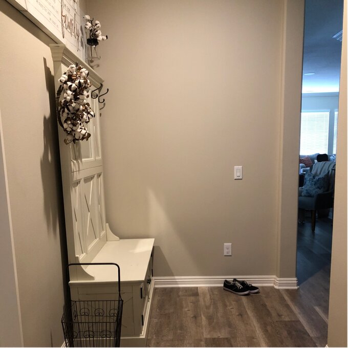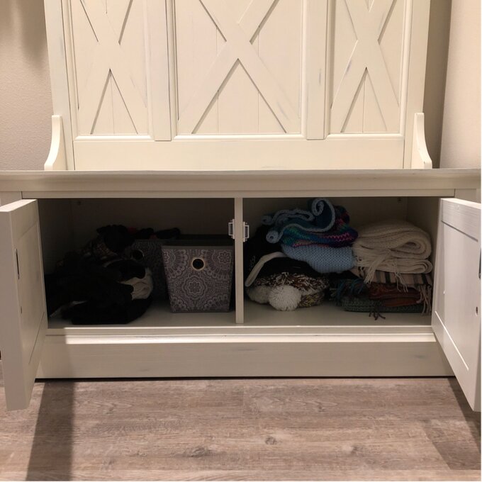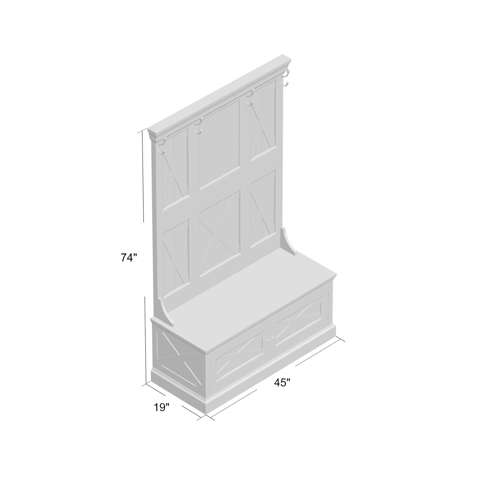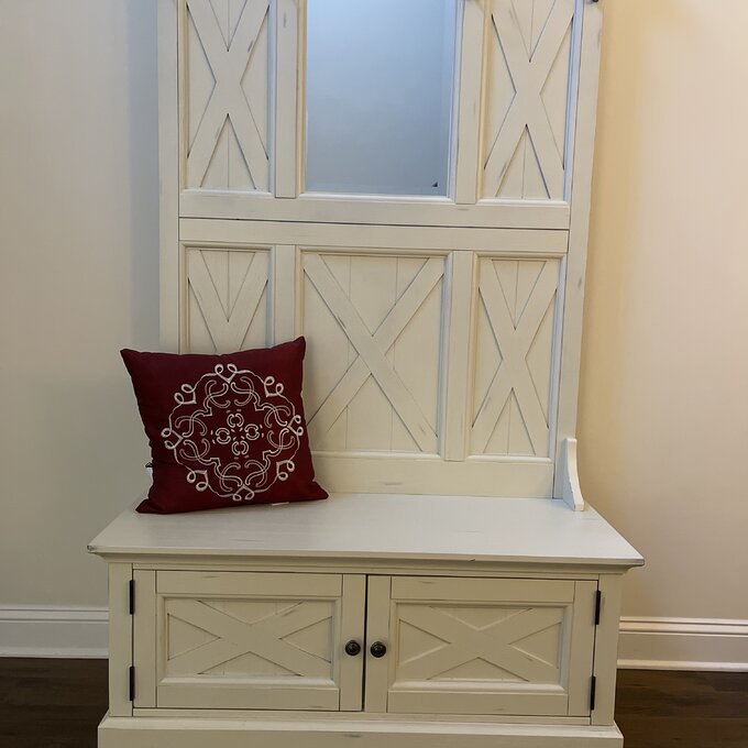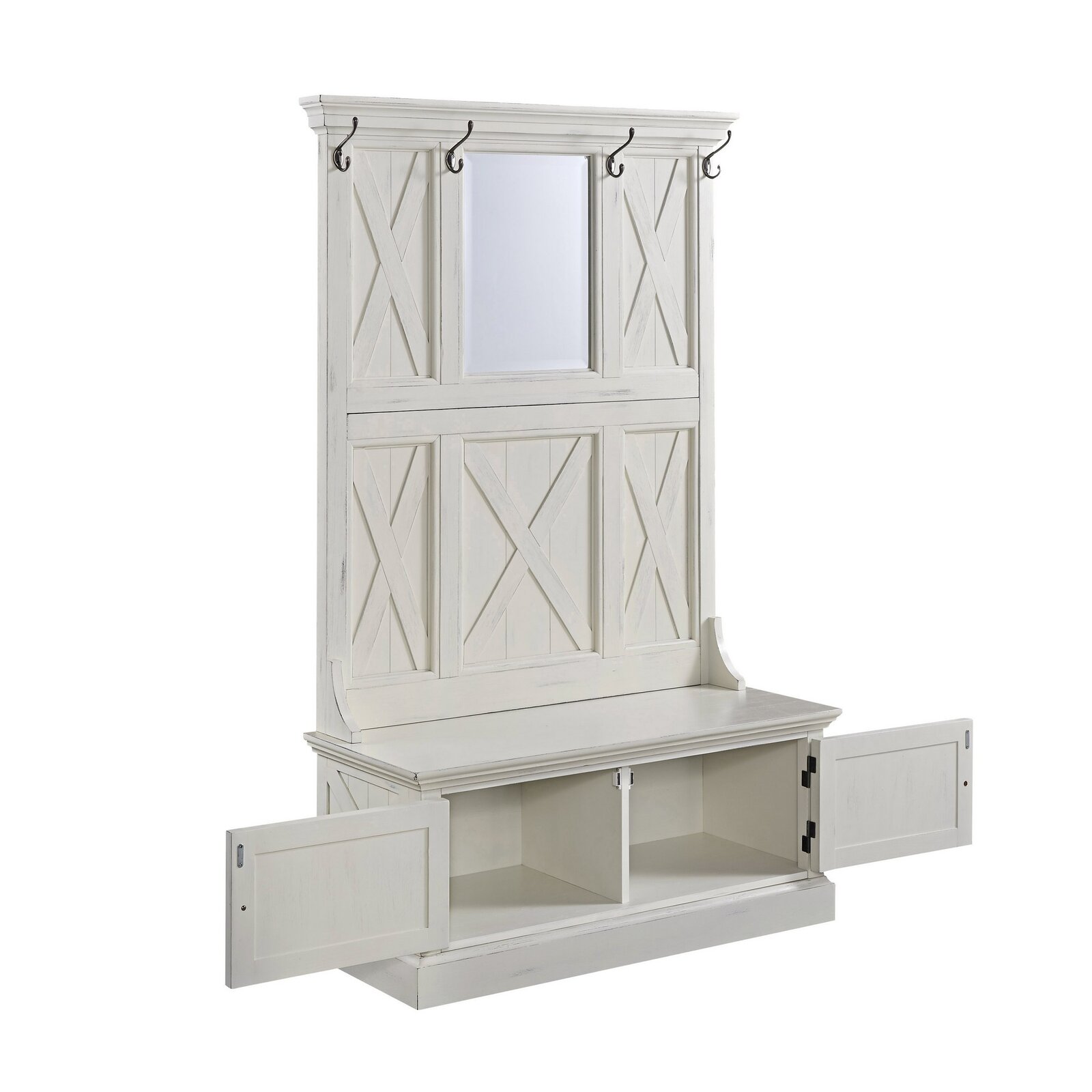 Corral clutter in the entryway without sacrificing style with this rustic hall tree. This piece sports a neutral white finish with wire-brushed details for an airy and weathered look. Four metal hooks in an antique nickel finish provide a place to hang hats, bags, and jackets, while a bench below offers out-of-sight storage space. For even more function, a beveled glass mirror sits in the center so you can check out your reflection as you head out of the door. X-shaped accents throughout round out the design with farmhouse flair.