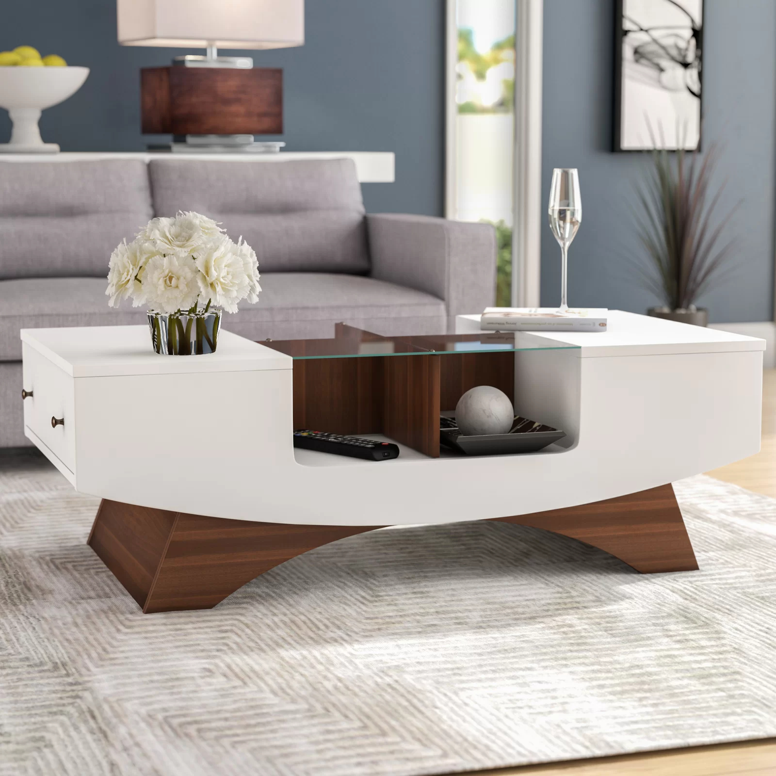 Anchor your seating ensemble in a sleek and chic style with this ultramodern coffee table. Distinctively designed, this piece features a wide body with a curved lower panel, while a trestle base provides stylish support. Four partitioned cubby shelves set under a pane of tempered glass offer organized storage for everything from remotes to coasters to board games and more, while two side drawers are great for storing batteries and matchbooks. Crafted of particleboard, polyurethane (PU) paper finishes with glossy wood veneers, this table can be wiped down with a multi-surface cleaner for effortless upkeep.
