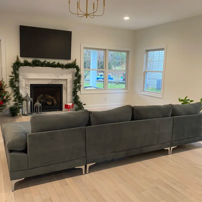 This U-shaped sectional sofa has two extra-wide chaise lounges. It seats up to six people comfortably, so the whole family can gather for a movie or game night. Its solid eucalyptus wood frame sits on silver-colored metal legs, and its cushions are foam supported by sinuous springs. This glam velvet-upholstered couch features pillow arms and a cushion back, and it has removable cushions and cushion covers. We love the way that the low, modern lines of this sofa make your ceilings feel higher and open up your space.