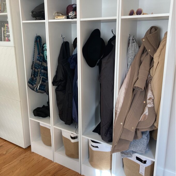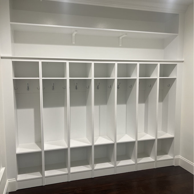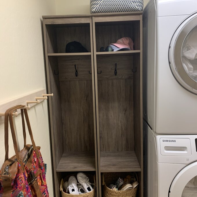 The narrow entryway organizer set is a great addition to any family room, recreation room, or mudroom. Ideal for growing families, you can use organizers individually or position them side-by-side to create a built-in look. Each organizer is designed for maximum functionality. The tall compartment is 56.5" high and has a lower shelf that can be adjusted to eight different heights. One large double hook on the rear, reinforced panel, and a single hook on each of the side panels allow ample room for hanging items. A fixed shelf on top with an 8" high compartment is spacious enough for decorative baskets, hats, and small bags. Each side panel has 4.75" high cutouts to accommodate baseboards. Constructed from non-toxic, CARB-2 compliant, laminated composite woods. Ships ready to assemble includes an instruction booklet for easy assembly and has a 5-year manufacturer’s limited parts warranty.