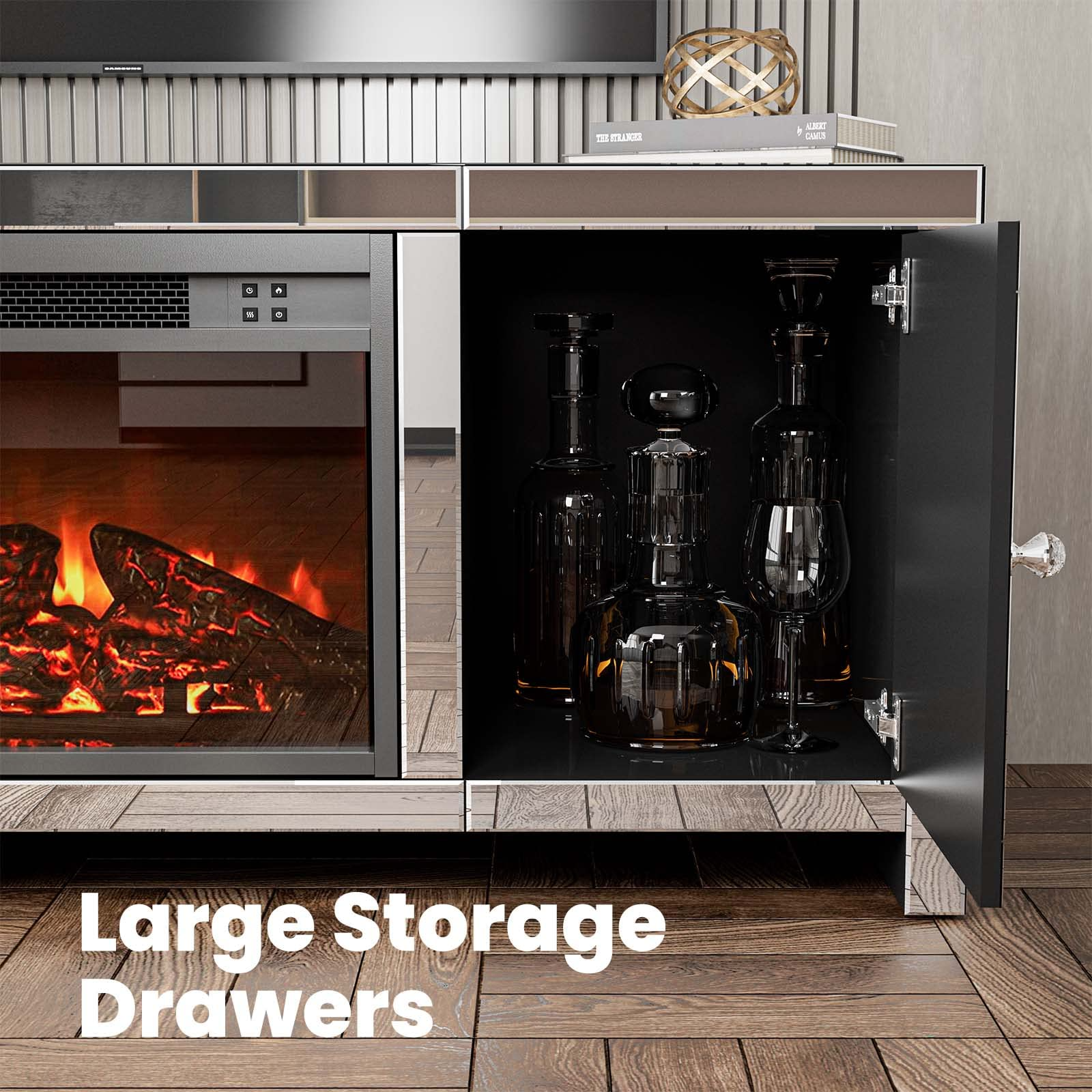 💎【High-Quality & Easy To Clean】The mirrored Fireplace TV Stand adopts high-Quality MDF board and smooth glass mirrored finish. A drawer with diamond handles for storage needs. Smooth surface of this Tv stand makes your cleaning more easier. The stains left on the tv stand can be quickly wiped, which also reduces your annoyance accordingly.