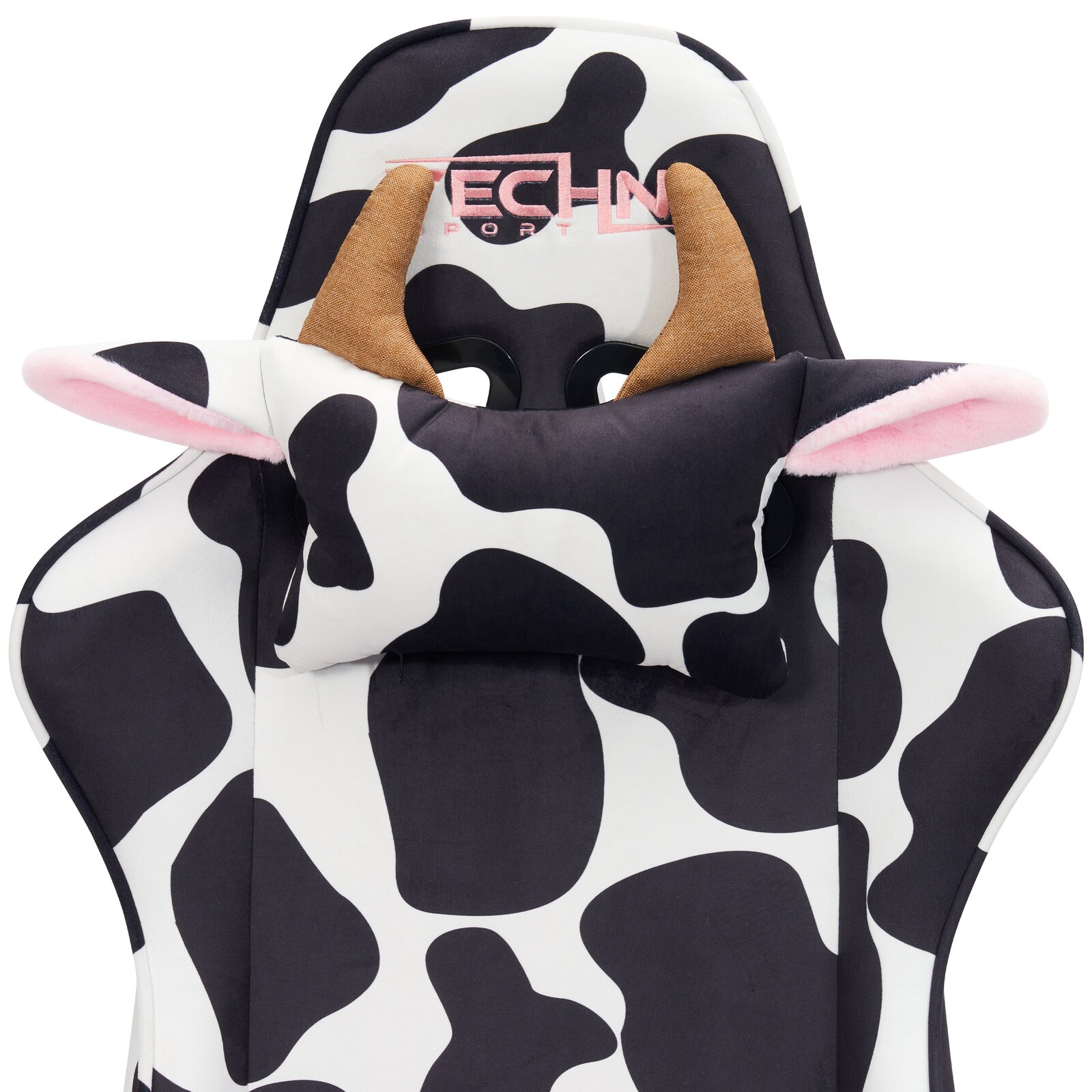Tell the other gaming chairs to "MOO-ve" out the way, because our new cow print gaming chair is exactly what you need to stand out. It has a smooth, velvet-like upholstery, a high-quality memory foam seat, a cow headrest with pink plush ears and brown horns, and a double-sided lumbar pillow! Providing the ultimate comfort, style, and performance, this gaming chair also features 2D adjustable armrests, pneumatic seat height adjustment, up to a 150-degree reclining mechanism, and much more!
