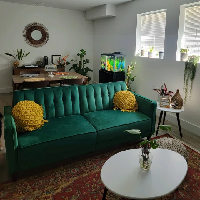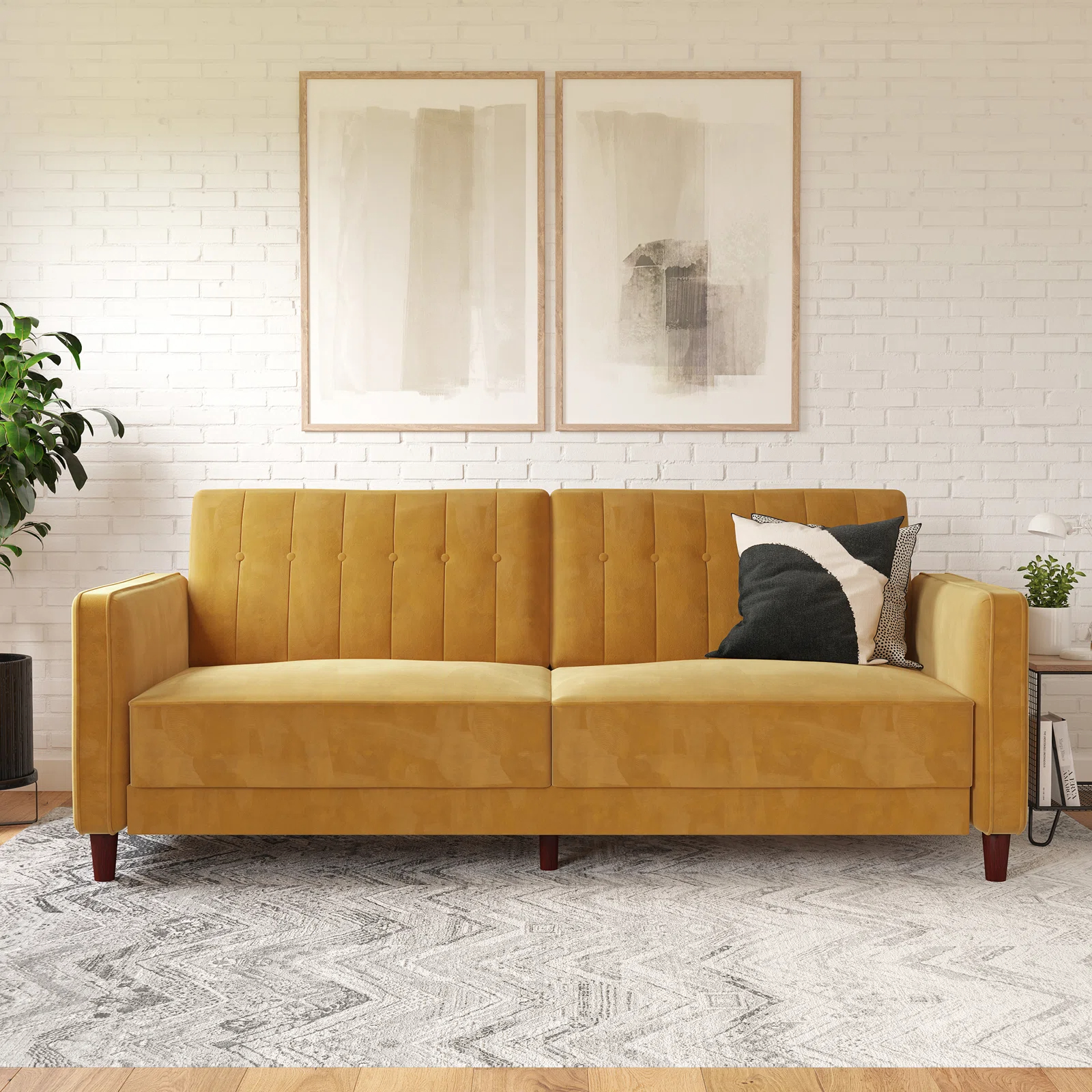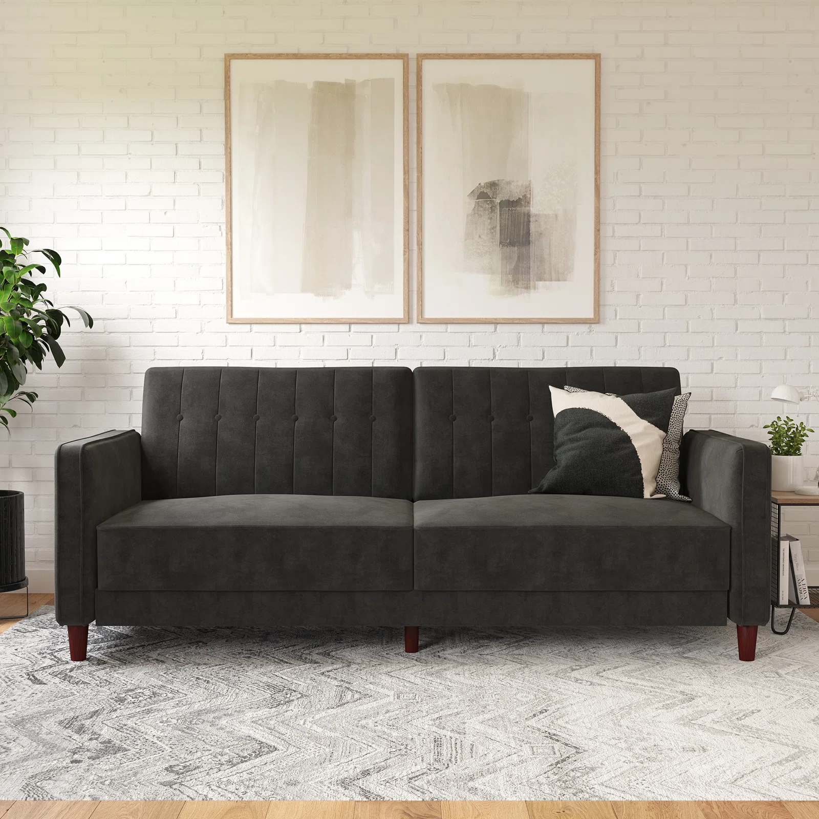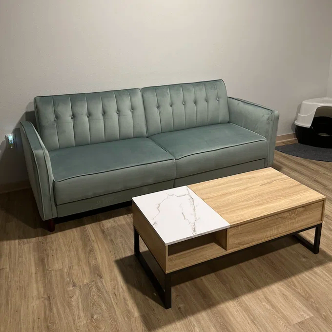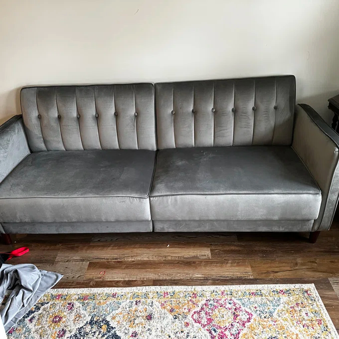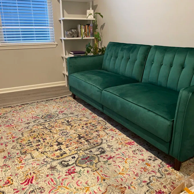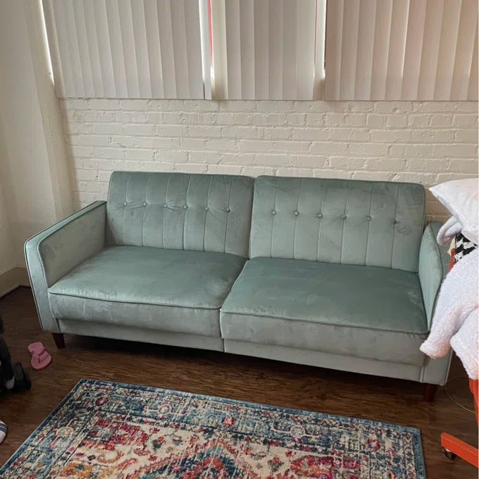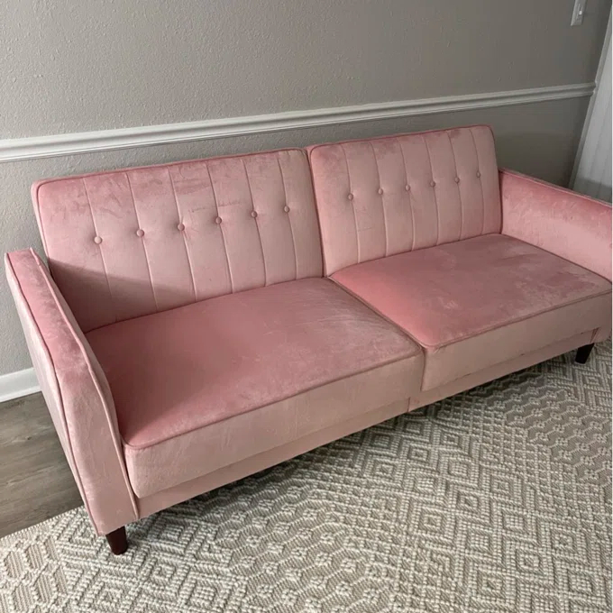 Nothing says class, sophistication, and smooth comfort quite like velvet, and the Perdue tufted transitional futon is the ultimate in style! The design itself is stunning. It combines thick cushioning with tufted velvet, sleek arms, tapered wooden legs, and a vintage look that takes you back to the bold and luxurious days of the 1950s. With a variety of colors to match your décor, this sofa can fit perfectly with a contemporary look, classic style, or more rustic-looking living space. What’s more, the split-back design seating can be independently lowered into a lounging or sleeping position so you can sit up to watch your favorite movie, lounge back to chat with friends, or offer overnight guests a perfectly comfortable place to spend the night. The Perdue tufted transitional futon comes with soft padding under all four feet to make it easy to move around and ensure your floors are never scuffed or scratched.