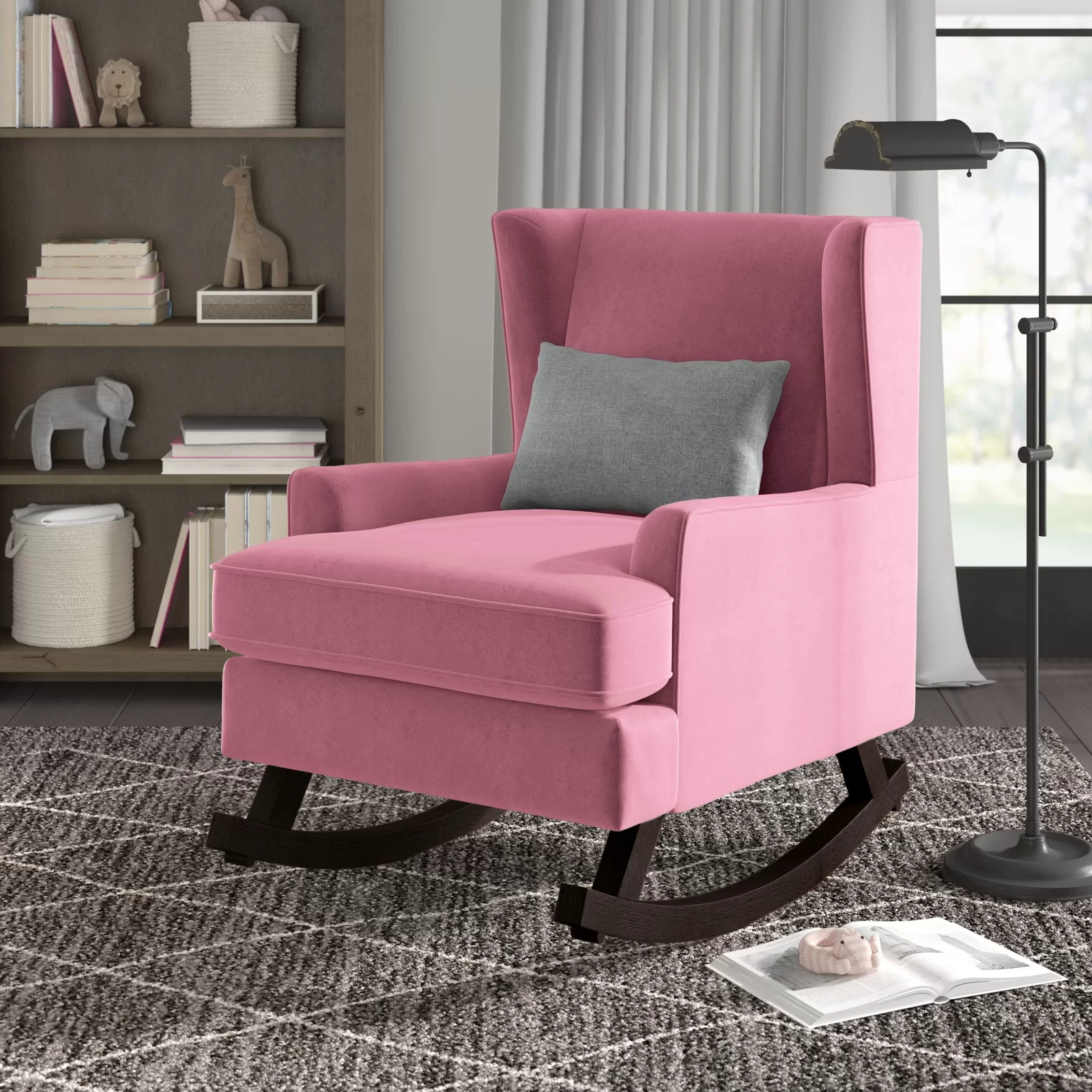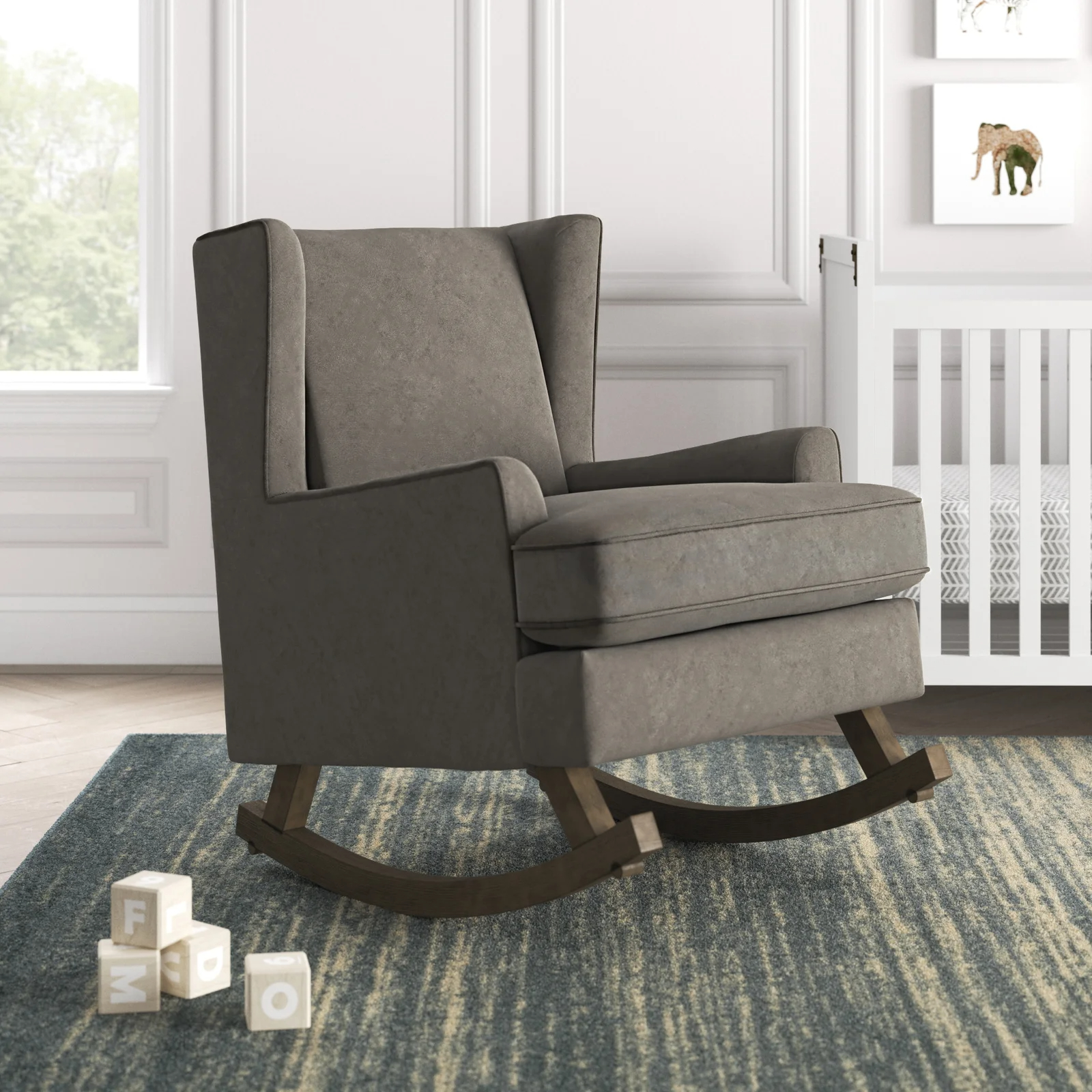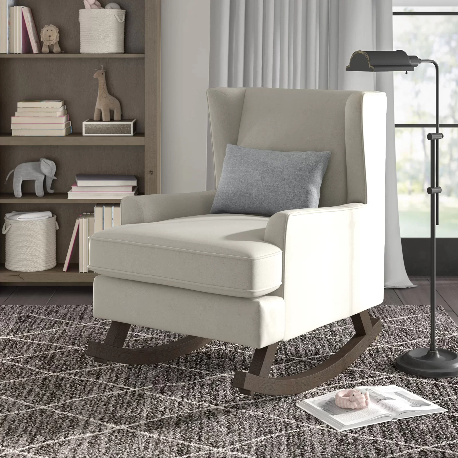 A contemporary take on a classic rocker, this glider lets you rock and read with your little one or round out your living room seating group in style. Crafted with a solid pine and plywood frame, this piece is filled with foam and upholstered with microfiber fabric in a versatile solid hue for a streamlined look. Track arms and angular winged sides give this design a modern feel, while the curved glider base below softens the clean-lined silhouette. Assembly is required.