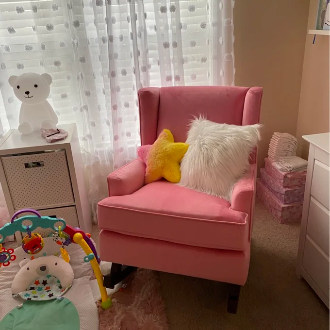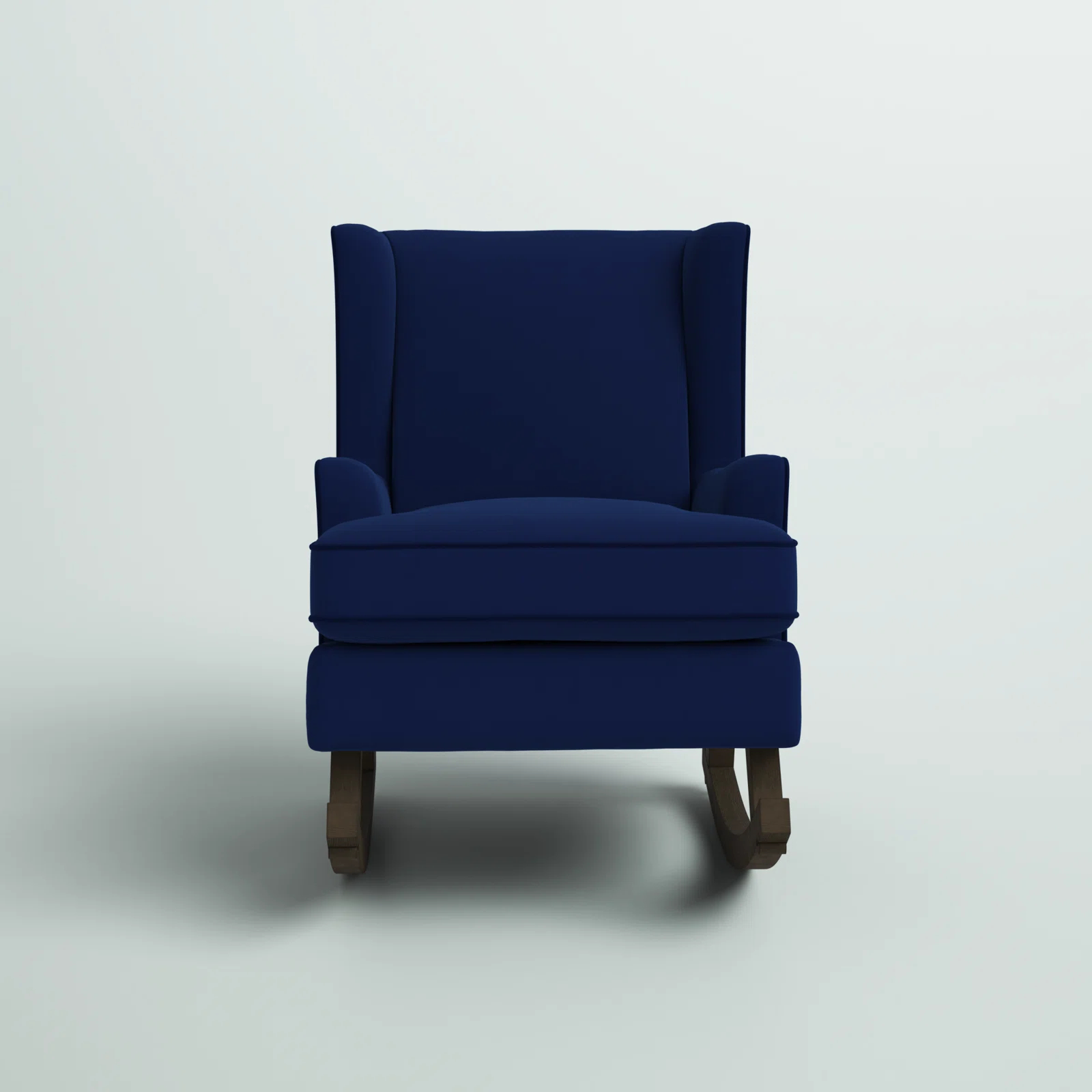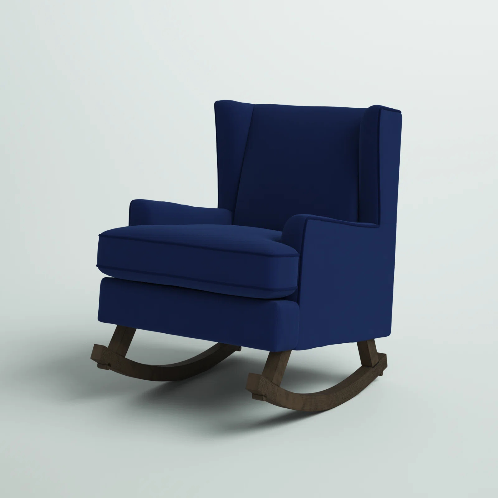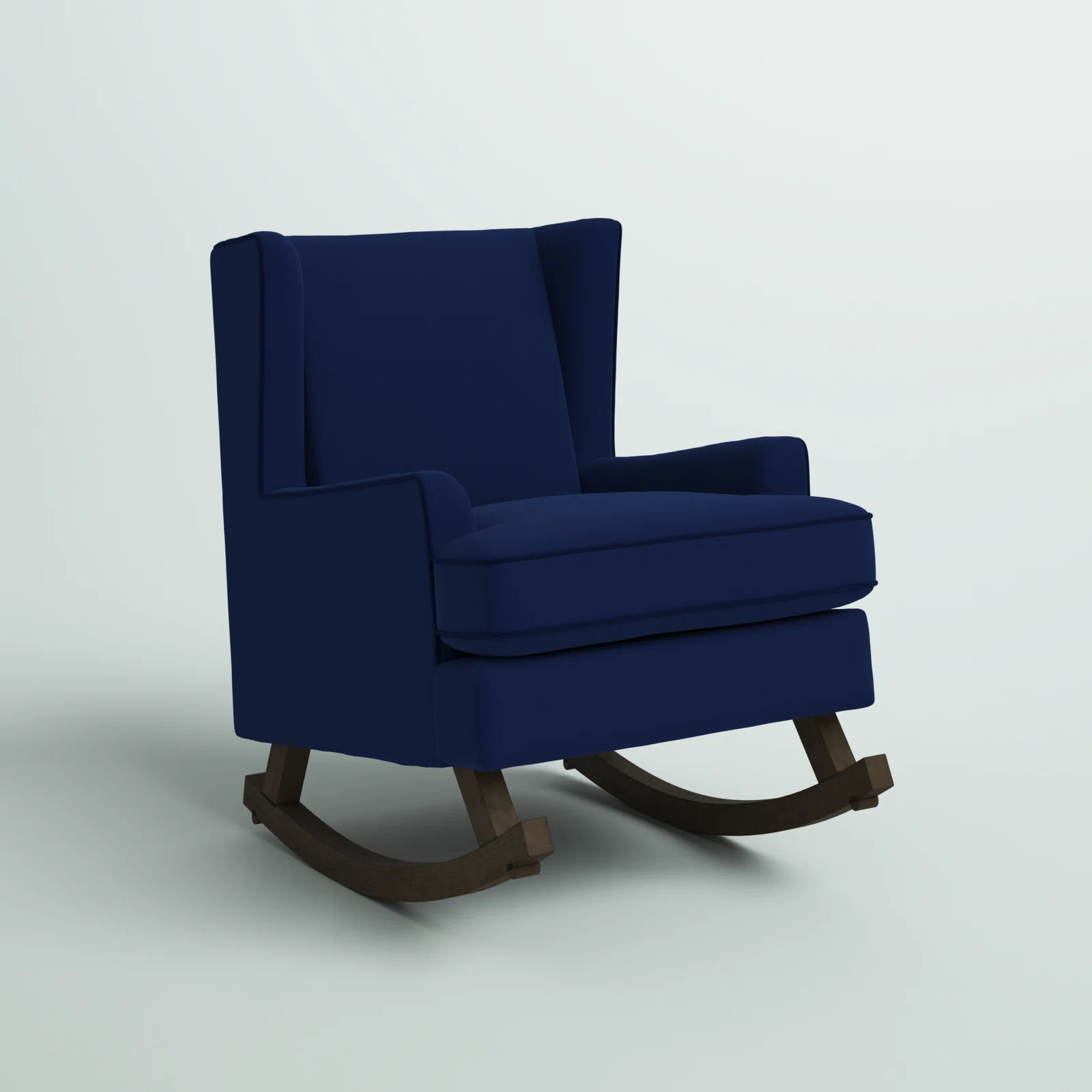 A contemporary take on a classic rocker, this glider lets you rock and read with your little one or round out your living room seating group in style. Crafted with a solid pine and plywood frame, this piece is filled with foam and upholstered with microfiber fabric in a versatile solid hue for a streamlined look. Track arms and angular winged sides give this design a modern feel, while the curved glider base below softens the clean-lined silhouette. Assembly is required.
