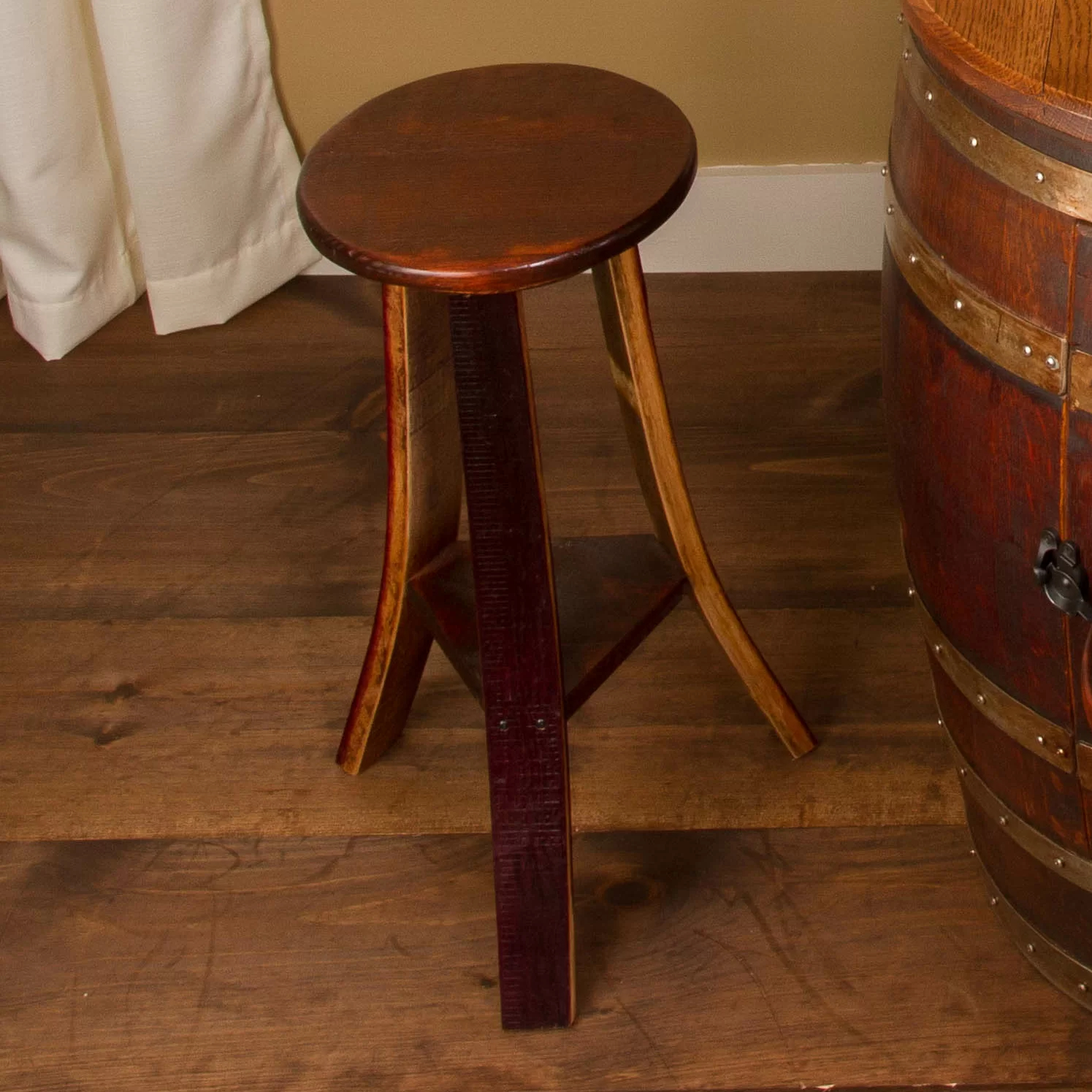This table set with cabinet base has a cabinet door that opens to a head lazy susan shelf. Tabletop is constructed from four heads with original French stamps. Table set comes with a removable Lazy Susan on top. All materials used in this table set are oak and are retired metal from California wineries. The French stamps are from various cooperages that made the barrels. Table set comes with a removable lazy susan on top. Set includes four stools constructed from staves and boast the deep red wine natural stain. This table set is a fantastic addition to any tasting room, wine cellar, pub, or home bar.