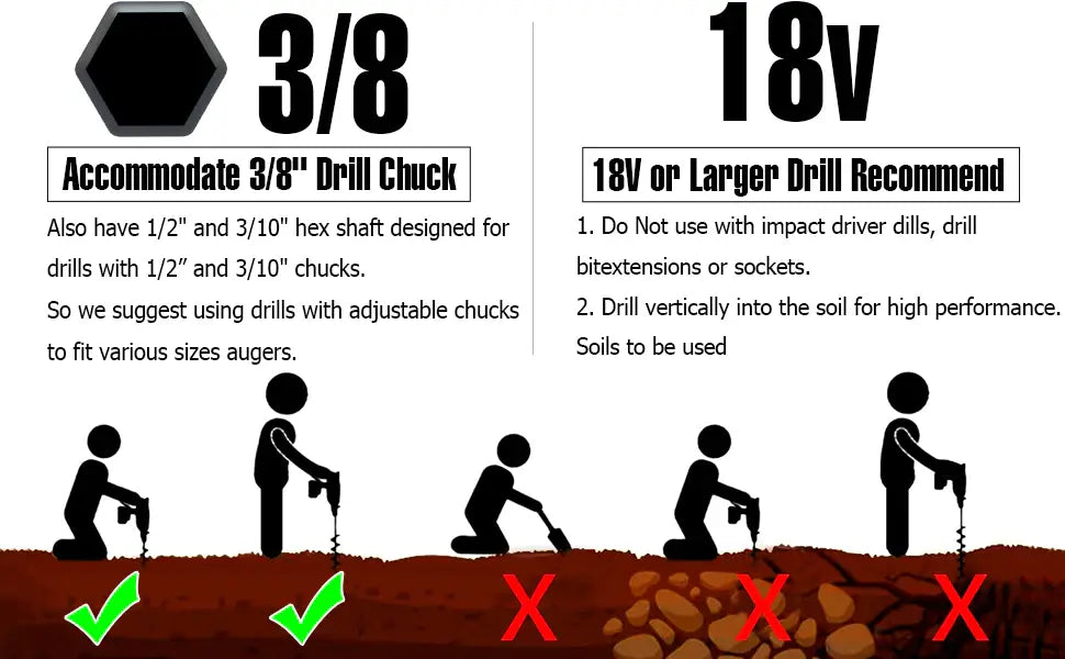 Attach the Gardening Auger Pro to a standard 3/8" hex bit. Hold with both hands, then open and dig down. Reverse the bit to pull the soil back into place and you have the perfect post hole.
