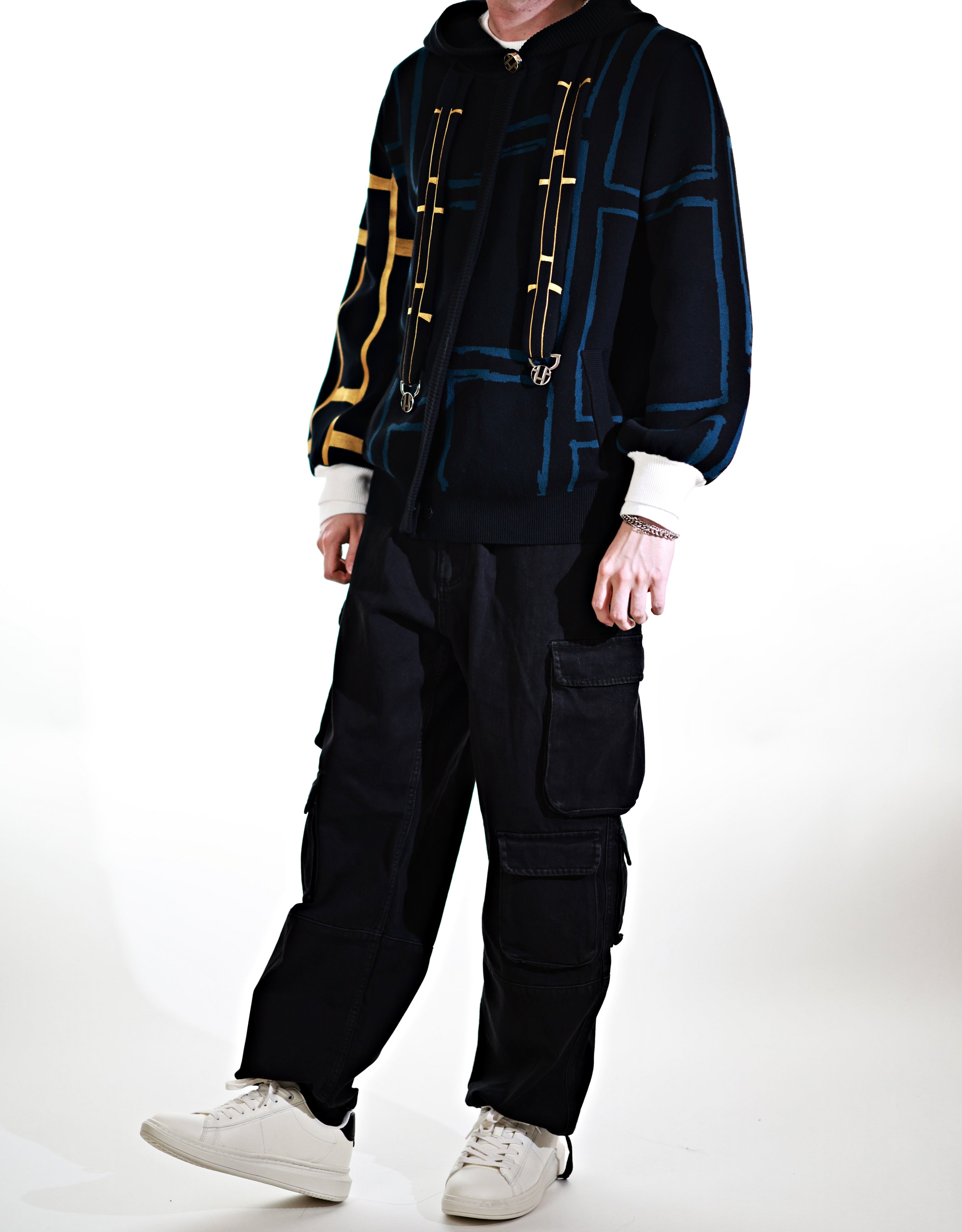 This whole collection features some of the most detailed embroidery we have ever made. The rainbow dragon on the back is made from over 100000 stitches and takes over 10 hours to stitch out. It also features a special holographic material that changes color to beautiful rainbow colors depending on the angle it gets hit with light. It remains more subtle in most lighting situations. The design also features our new magnetic buttons and pendants that let you customize your hoodie and add your own touch! It comes with a set of button top pieces that can easily be interchanged with top pieces from other hoodies from this collection. You will also be able to purchase complementary top pieces as an add on in the future to further customize these hoodies. The pieces are made from high quality metal and black resin. The fabric is made from the highest quality 100% cotton yarns. The right sleeve is also fully embroidered with a pattern similar to Geto's outfit in the show. The design also features jacquard patterns on the sleeves and a curved Zipper to give this design an even more unique look.