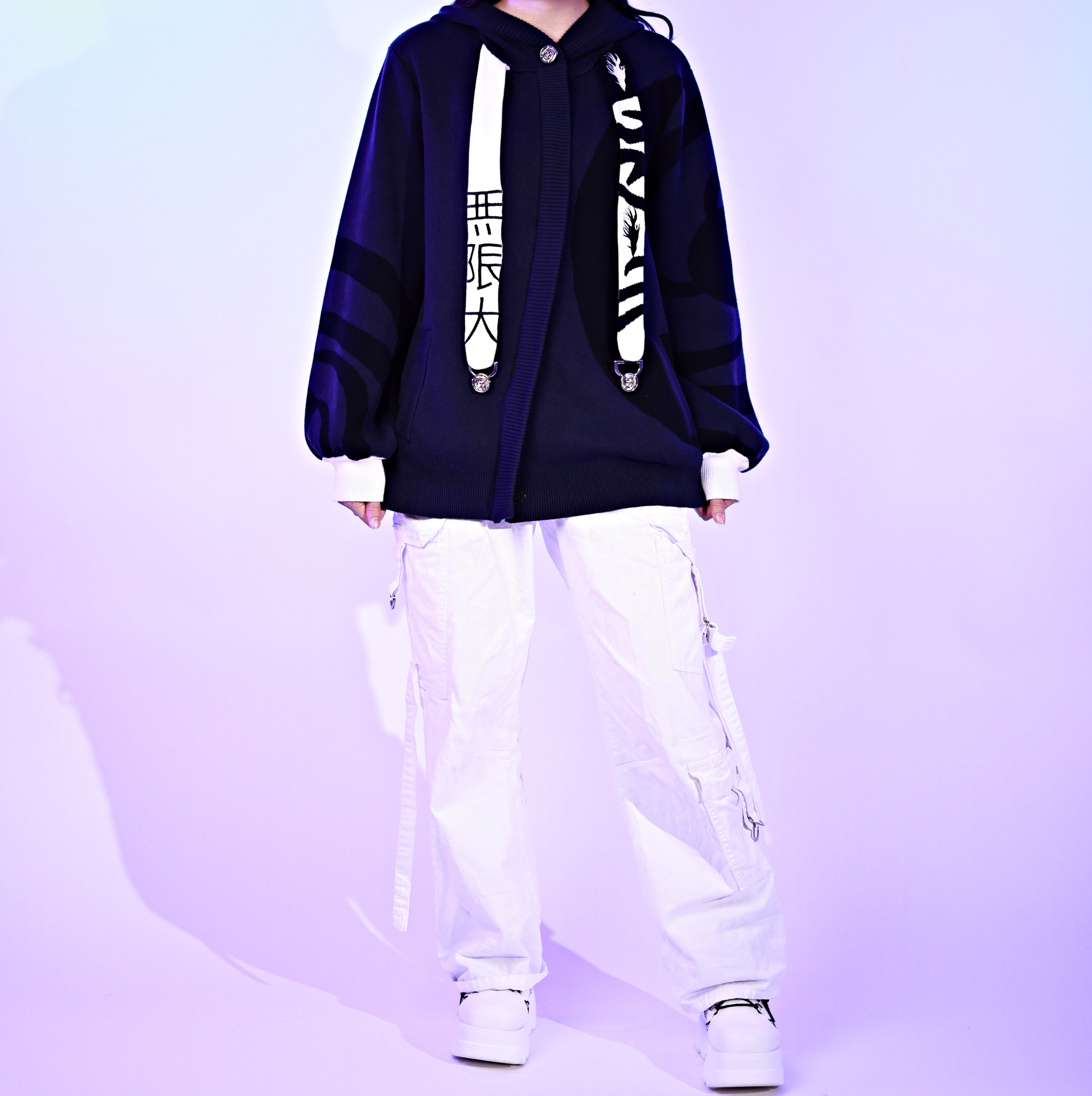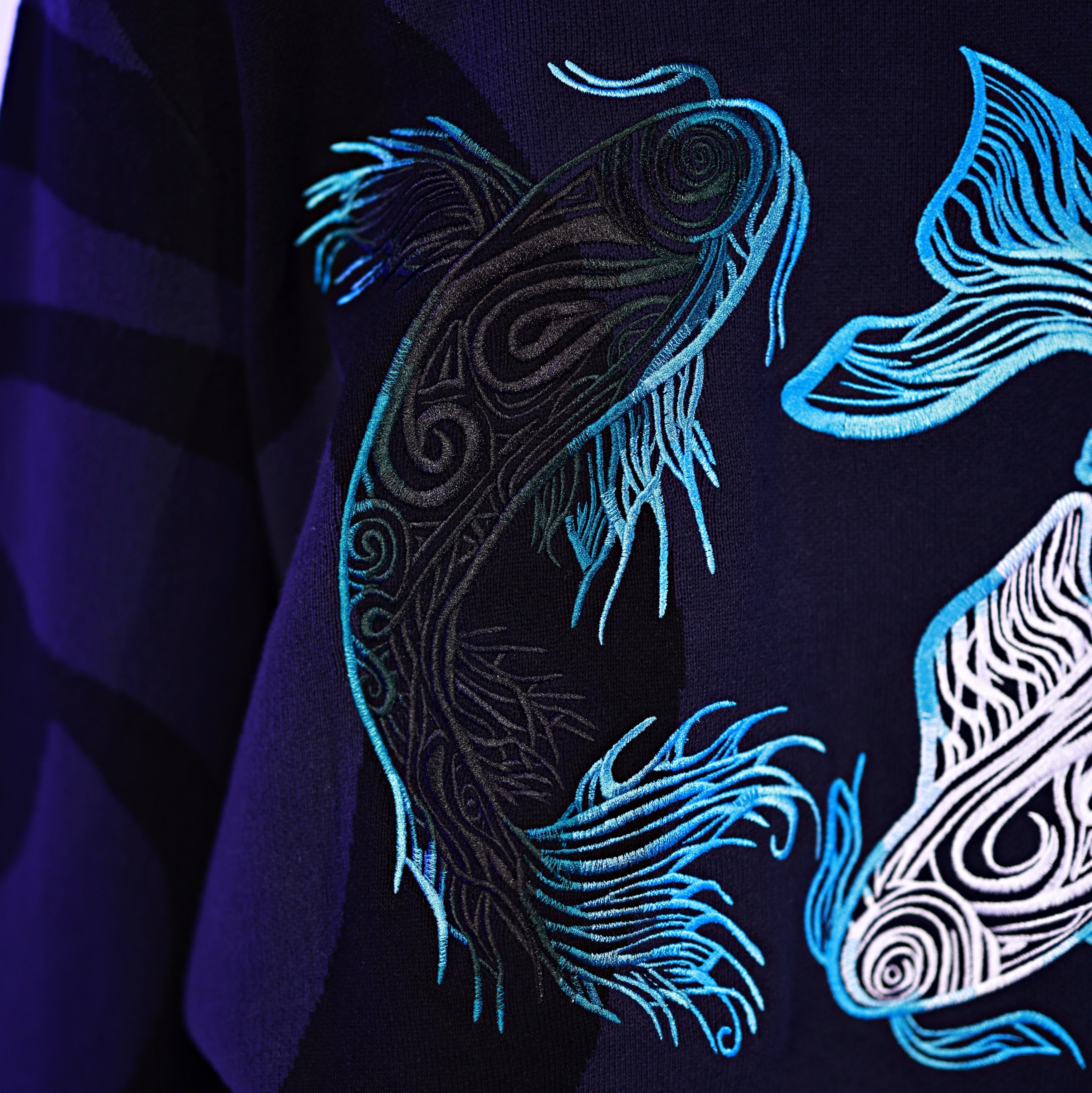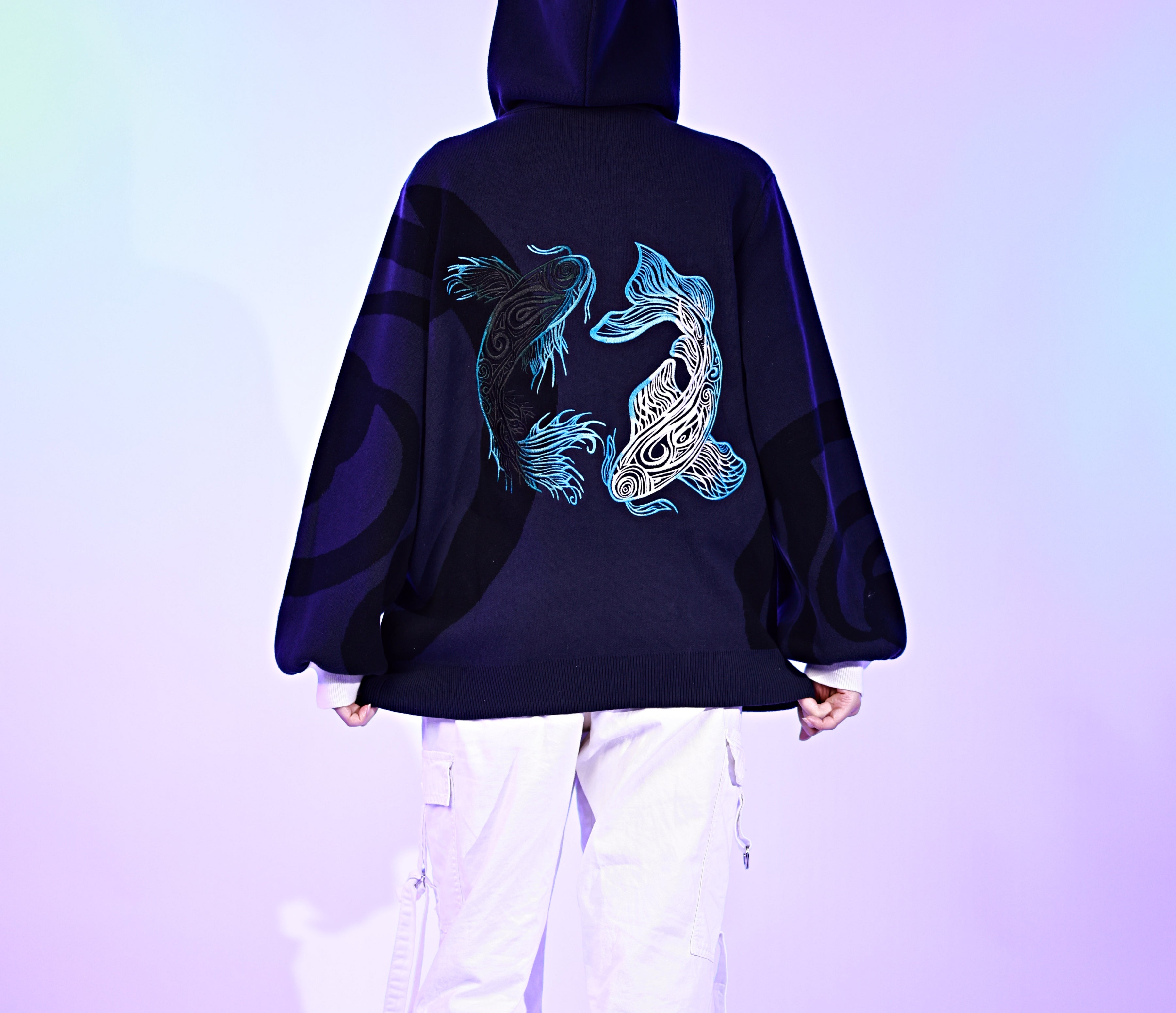 This whole collection features some of the most detailed embroidery we have ever made. The design features our new magnetic buttons and pendants that let you customize your hoodie and add your own touch! It comes with a set of button top pieces that can easily be interchanged with top pieces from other hoodies from this collection. Your will also be able to purchase complementary top pieces as an add on in the future to further customize these hoodies. The pieces are made from high quality metal and polished abalone shells. Each top piece has completely unique & very beautiful colors similar to Gojo's eyes.  The fabric is made from the highest quality 100% cotton yarns and features very detailed embroidery of the fish representing Gojo and Geto. The design also features gradient jacquard sleeves and a curved Zipper to give this design an even more unique look.