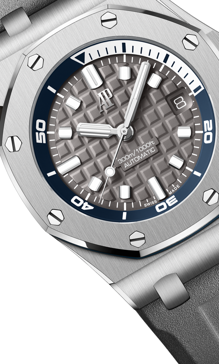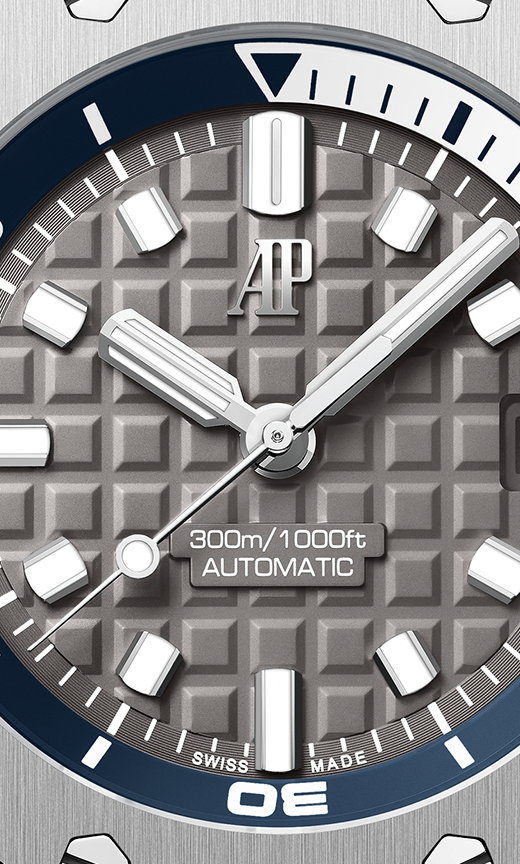 DIAL : Grey dial with “Méga Tapisserie” pattern, white gold applied hour-markers and Royal Oak hands with luminescent coating, blue rotating inner bezel with zone from 60 to 15 minutes in white