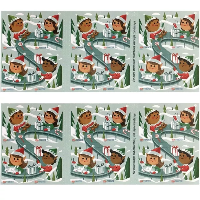 The Holiday Elves stamps are being issued as Forever® stamps in booklets of 20. These Forever stamps will always be equal in value to the current First-Class Mail® one-ounce price.