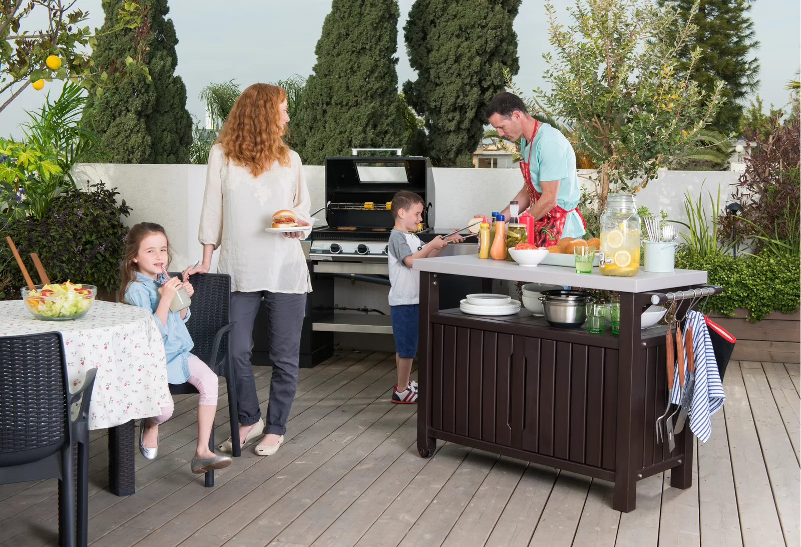 A:"A cabinet down below can stow away extra outdoor dining supplies you might need, while the five hanging hooks can keep your grilling tools organized. This piece also features a paper towel roll holder, and a spice rack, to keep you prepared for anything when enjoying the outdoors."