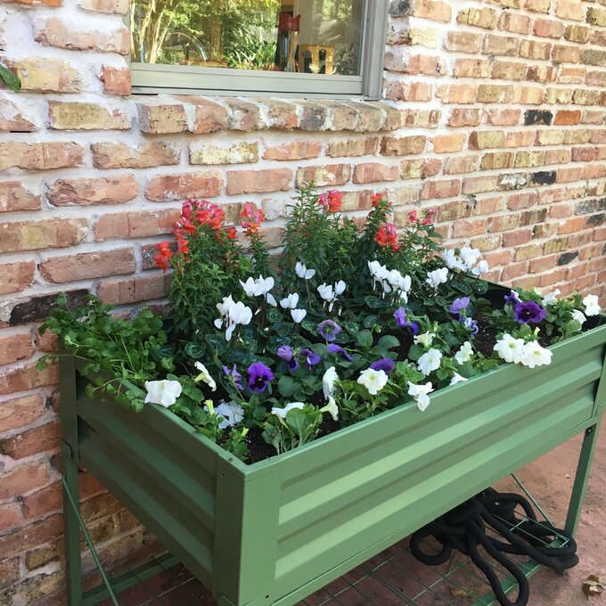 Raised garden bed planter keeps the space for gardening compact with enough space to grow all the vegetables needed for a salad! The steel frame on this free-standing unit assembles without tools. The bed is raised on legs offering unique waist-high gardening. Easily grow your tomatoes, peppers, cucumber radishes, lettuce, and herbs. You can create a garden whether you have a patio or a huge yard. Four sturdy steel panels interlock to create the frame by using a keyhole locking mechanism (patent pending). corrugated stamping on each panel adds strength and the powder-coated finish resists rust to give you many seasons of use. The polypropylene liner sits inside this frame, keeping soil contained and helping retain moisture. It also disassembles for seasonal storage, and the panels may be placed inside the liner bag for convenient storage.