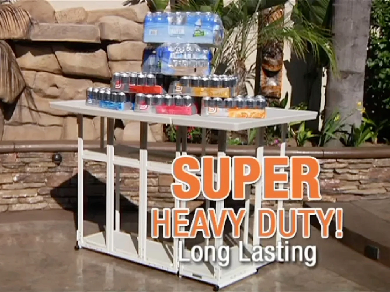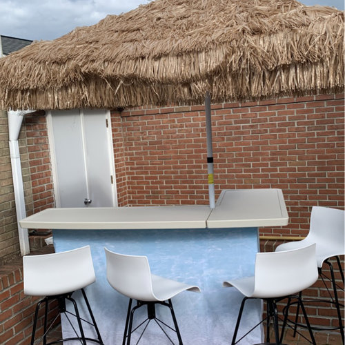 - Set Includes: Commercial grade steel L-shape frame, a drop-in cooler that holds up to 1 case of drink, a set of 4 padded barstools with custom printed covers, a palapa (tiki) umbrella, and a deluxe travel bag with wheels