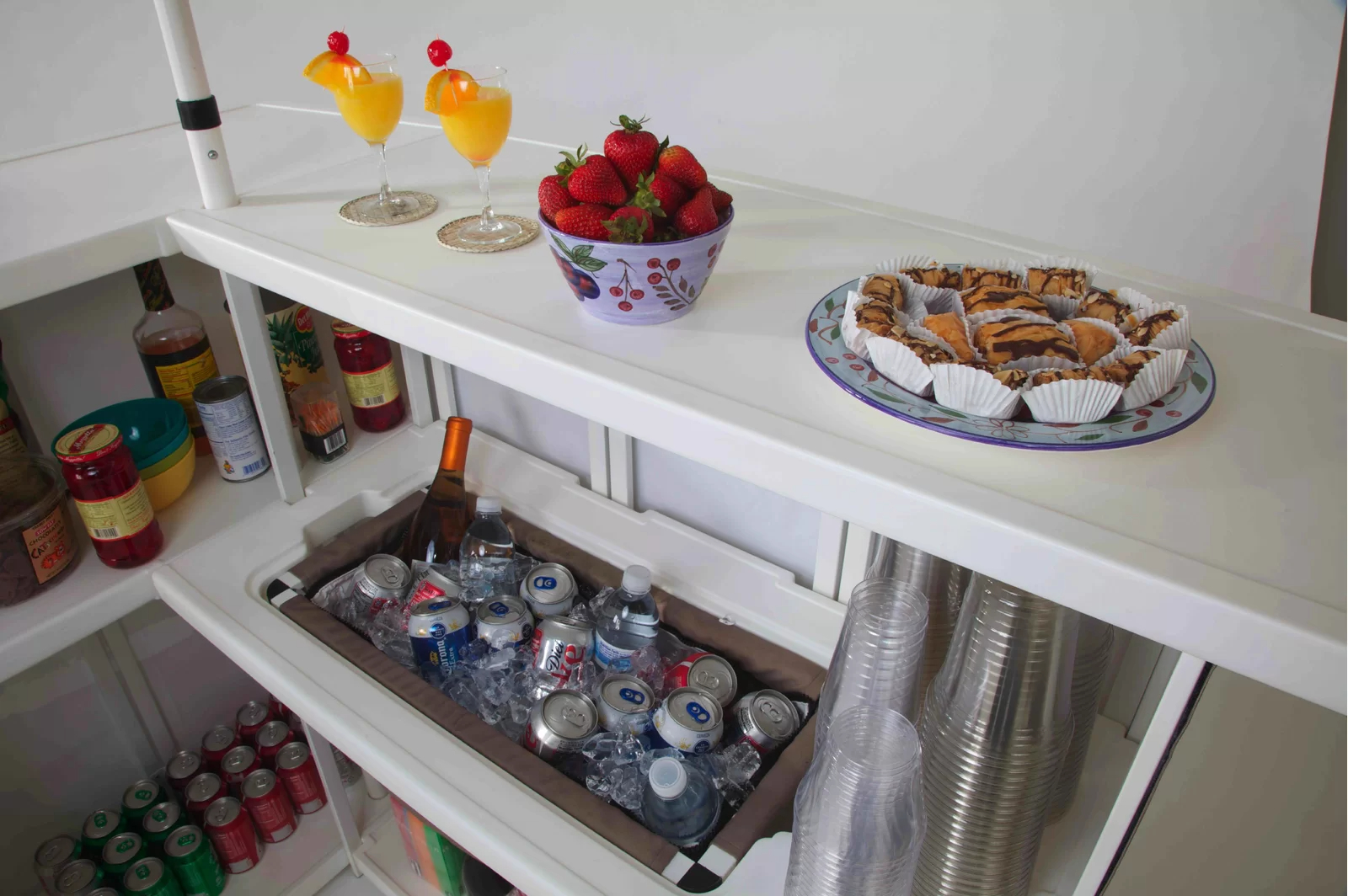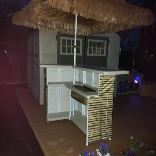 - Pieces Included: Commercial grade steel L-shape frame, a drop-in cooler that holds up to 1 set of 4 padded bar stools with custom printed covers, a palapa (tiki) umbrella, and a deluxe travel bag with wheels