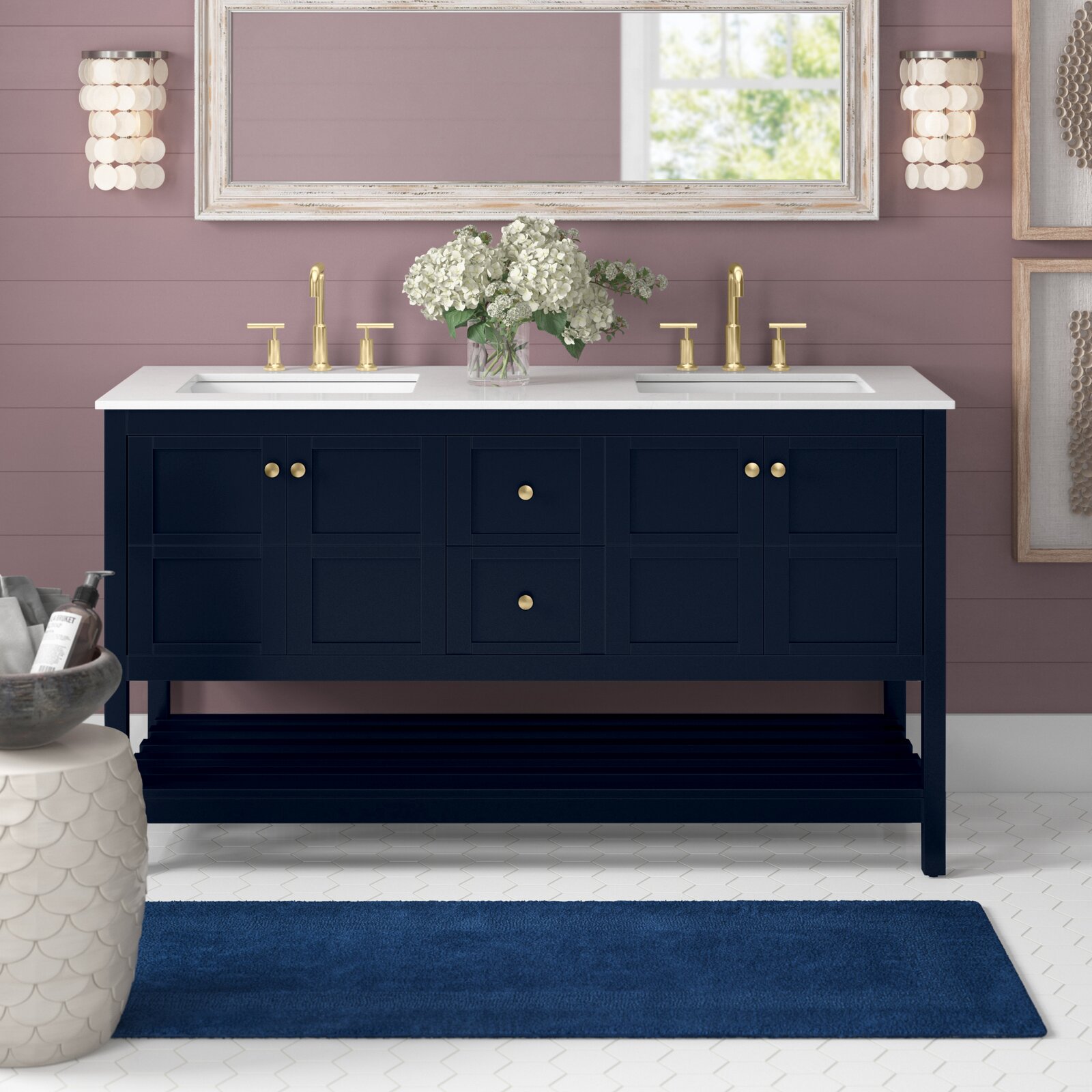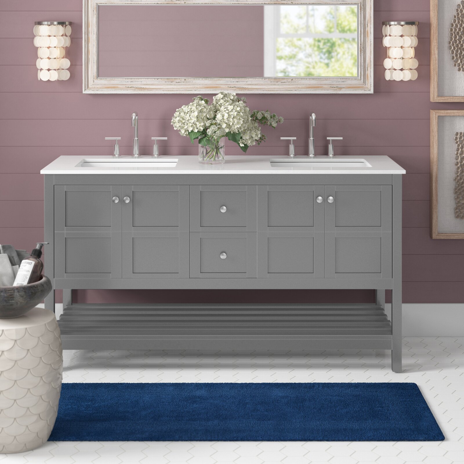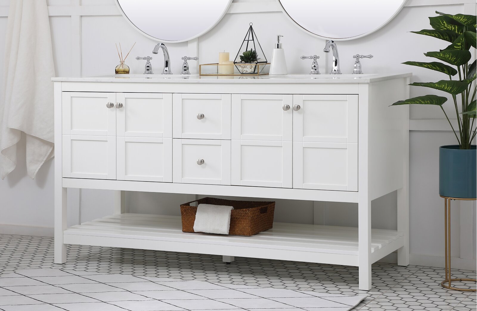 This 60" freestanding double vanity gives you and your family a place to get ready in the morning or spruce up after a day at the beach. It has a solid and engineered wood base with a quartz countertop. This bathroom vanity features two rectangular, porcelain undermount sinks (faucets sold separately). Two paneled doors beneath each sink open to reveal room for towels and cleaning supplies. Two functional drawers in the center offer space for toiletries and other bathroom essentials. Plus, there's an open slatted shelf at the bottom for easy-to-reach items. Best of all, this vanity arrives fully assembled.