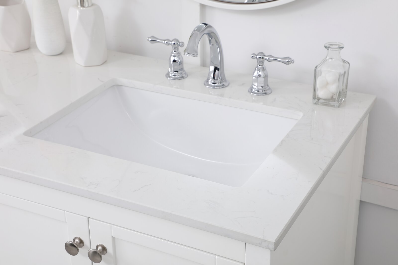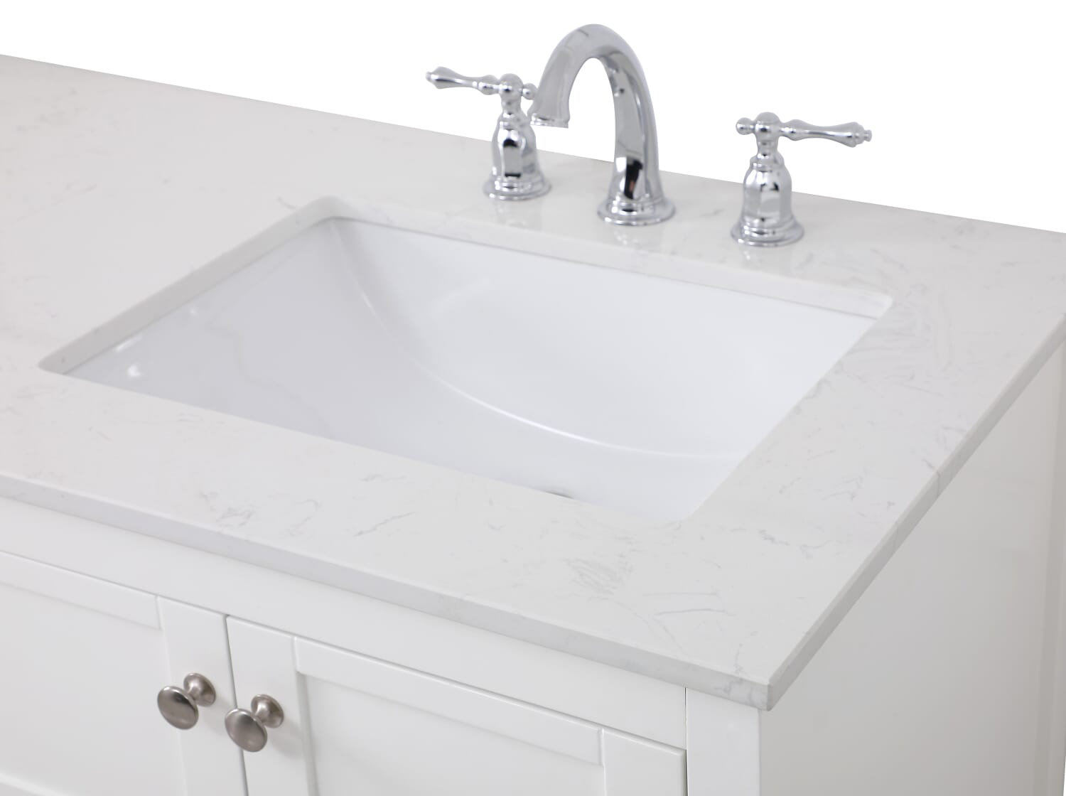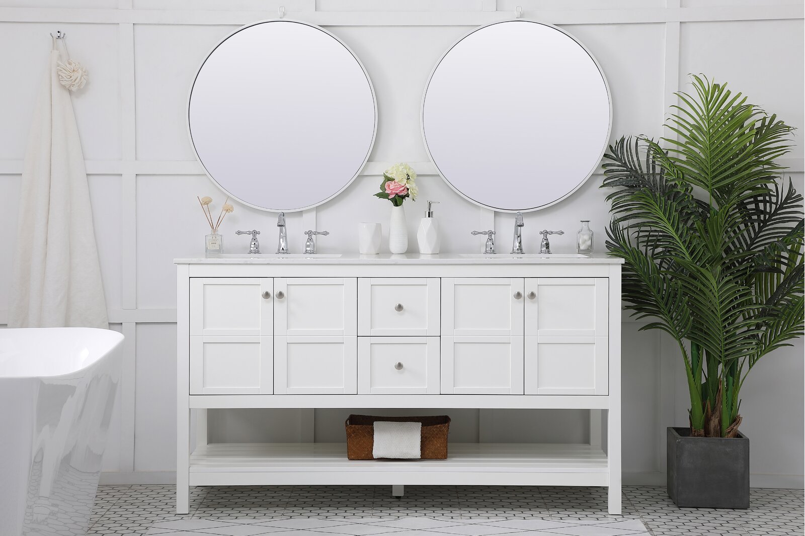 This 60" freestanding double vanity gives you and your family a place to get ready in the morning or spruce up after a day at the beach. It has a solid and engineered wood base with a quartz countertop. This bathroom vanity features two rectangular, porcelain undermount sinks (faucets sold separately). Two paneled doors beneath each sink open to reveal room for towels and cleaning supplies. Two functional drawers in the center offer space for toiletries and other bathroom essentials. Plus, there's an open slatted shelf at the bottom for easy-to-reach items. Best of all, this vanity arrives fully assembled.