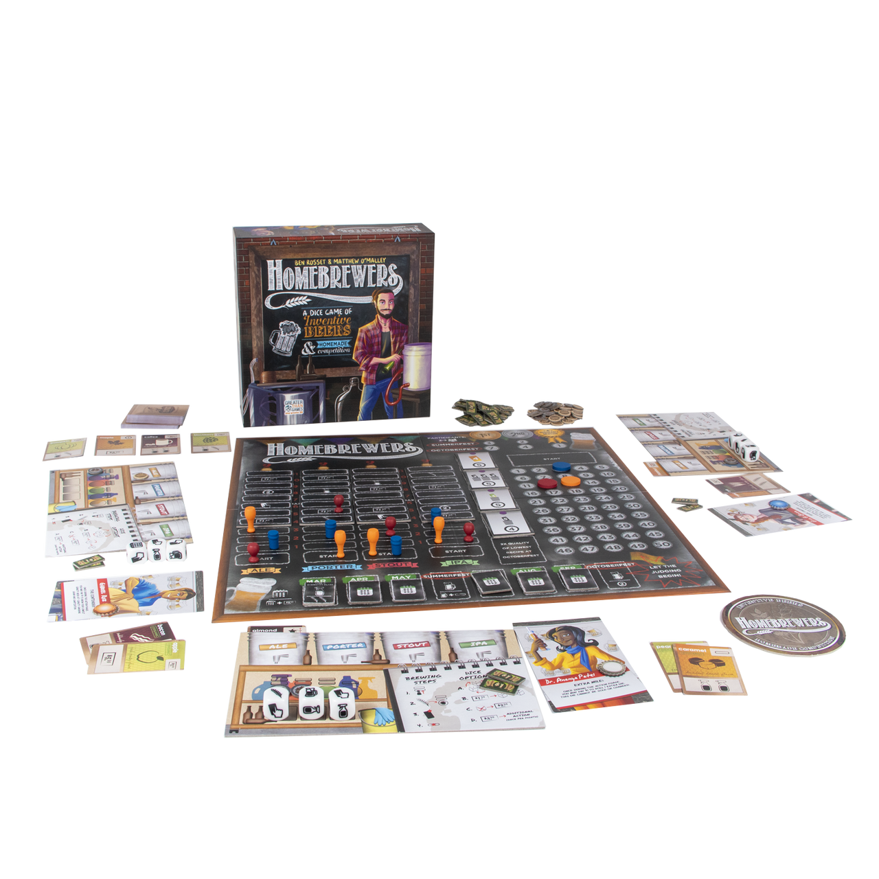 Homebrewers is an engine-building and dice-trading game. Your dice represent the actions you can take, such as buying ingredients, participating in monthly events, adding flavors to your recipes, and of course, brewing beer! Homebrewers is played over eight months (eight rounds). Each month, you meet with the homebrewing club one weekend (trade phase) and take actions the other weekends (action phase).