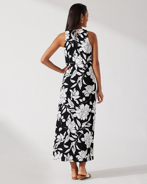 Timeless black and white florals stand out on an elegant maxi dress that naturally lengthens the silhouette for a figure-flattering and undeniably sophisticated look.