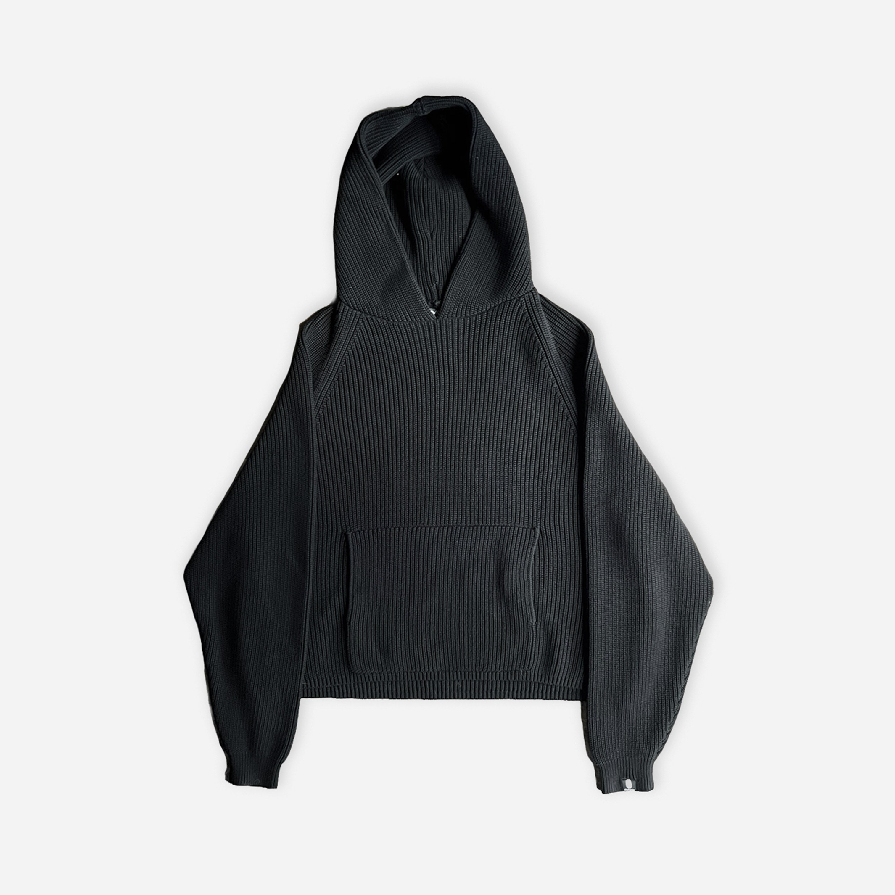The JJK School Knit?Hoodie in Black is crafted with super heavy-weight knitted cotton, with an?oversized crop fit. It features?a large graphic on the back and an oversized hood. The hoodie has ribbed cuffs and is finished with a Shihiko sleeve tag.