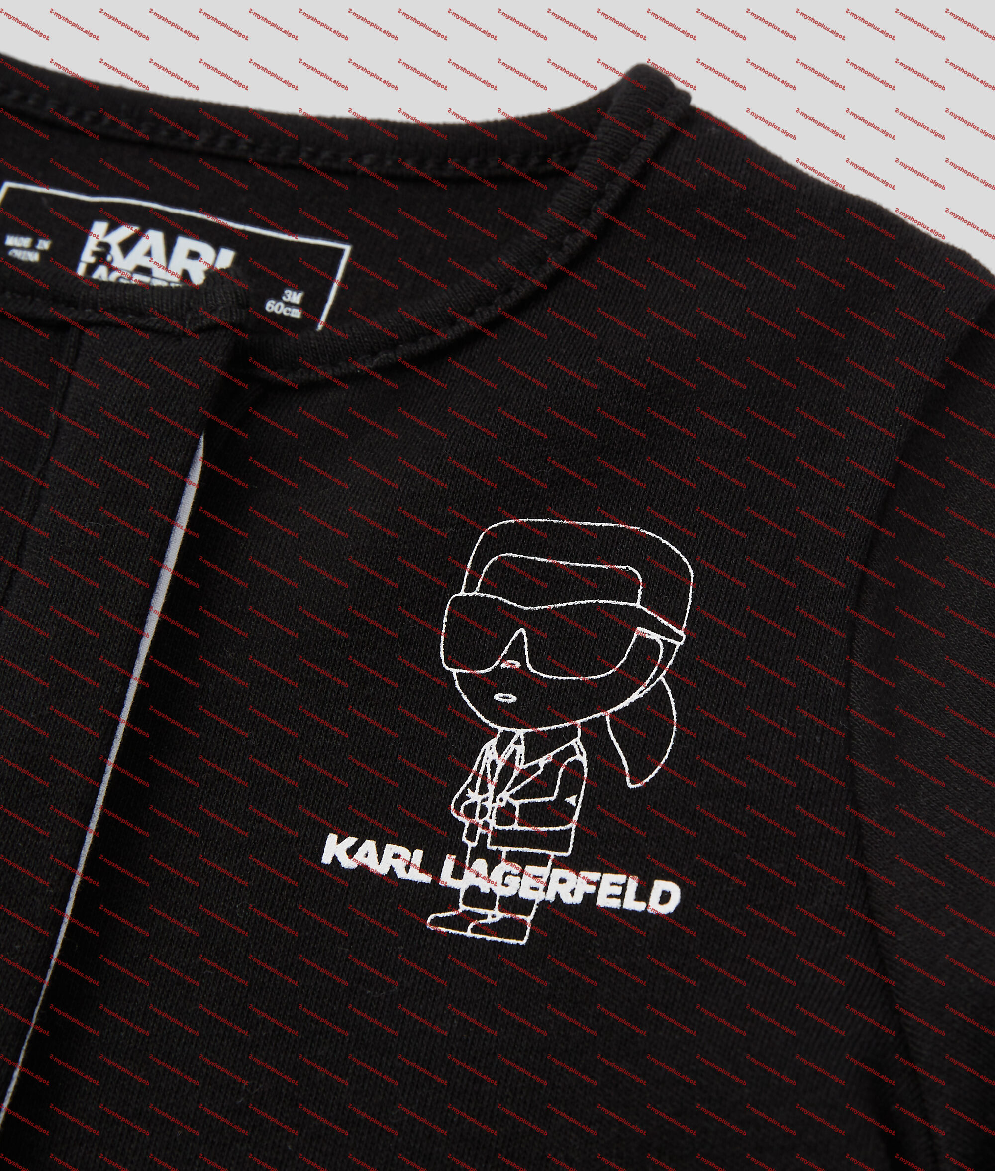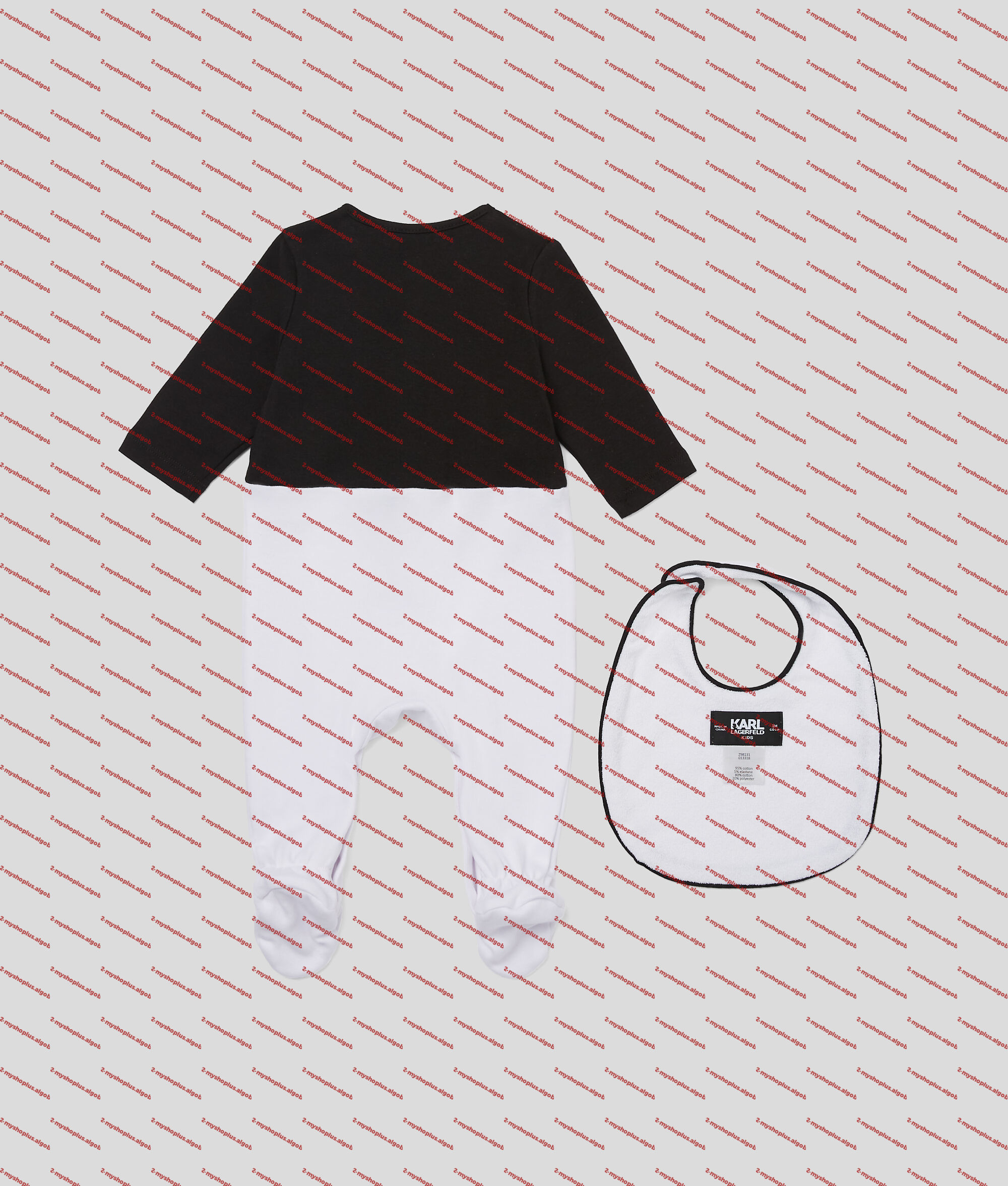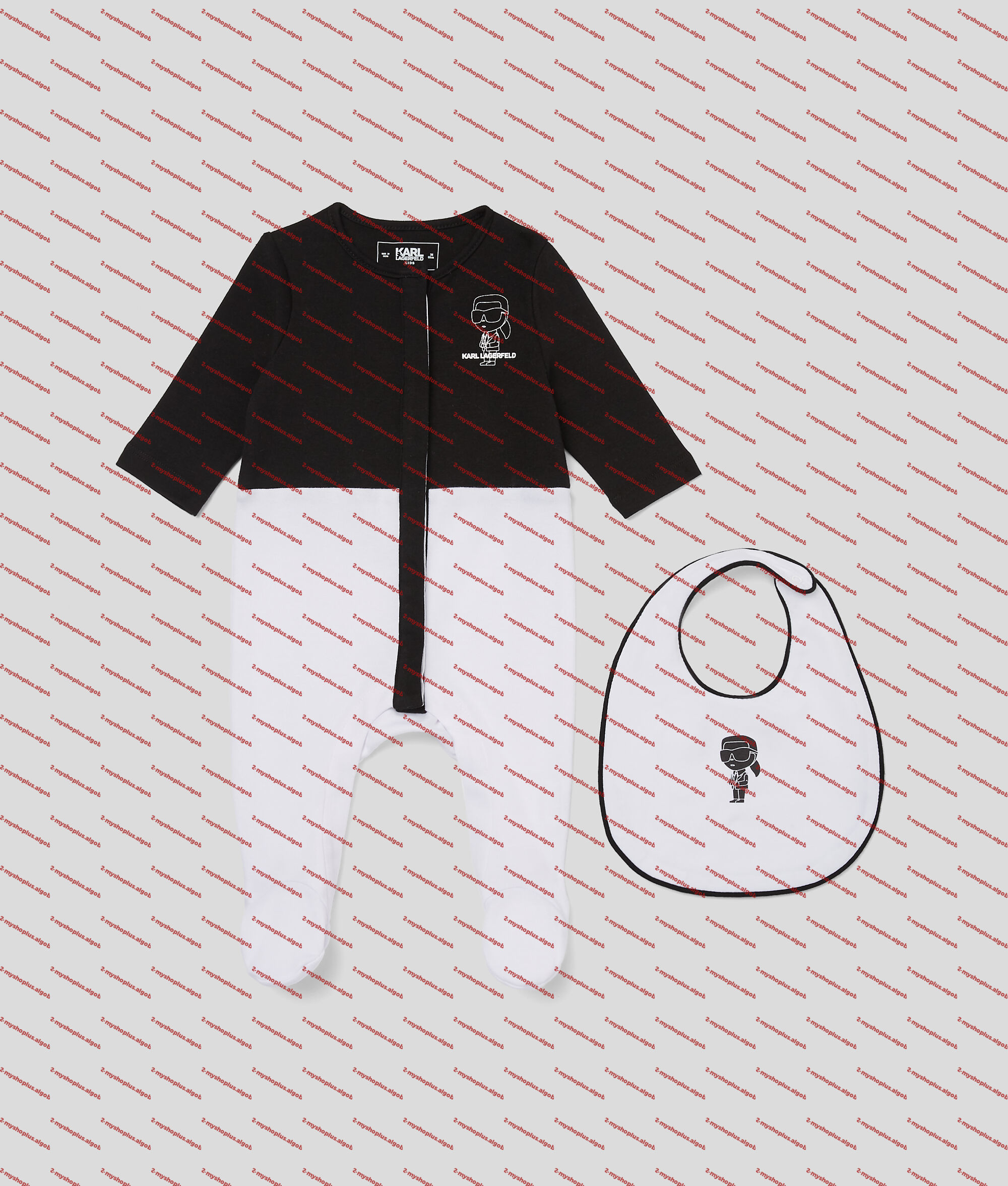 Un ensemble monochrome composé d'un pyjama et d'un bavoir assorti, orné d'un motif K/Ikonik Karl sur la poitrine et le bavoir.