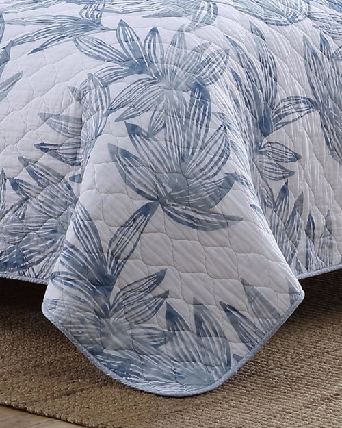 Transport your sanctuary to a lush island landscape with this beautiful, reversible quilt set. The vibrant watercolor blue hues paint a calm tapestry so you can relax, get cozy, and dream of paradise.