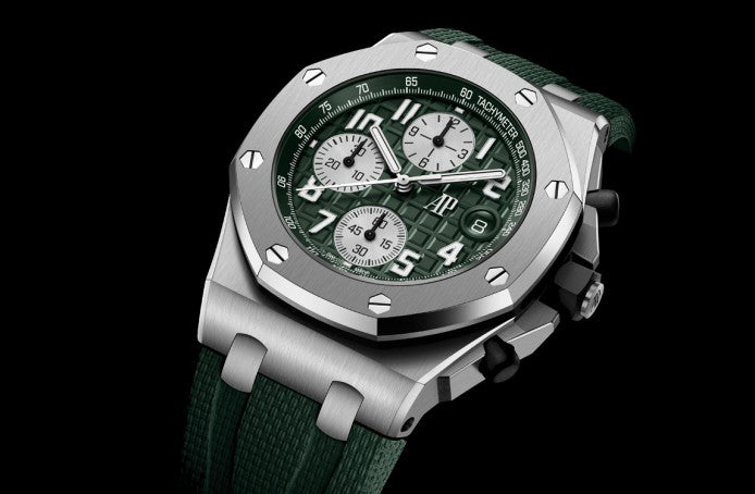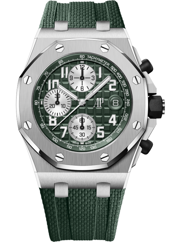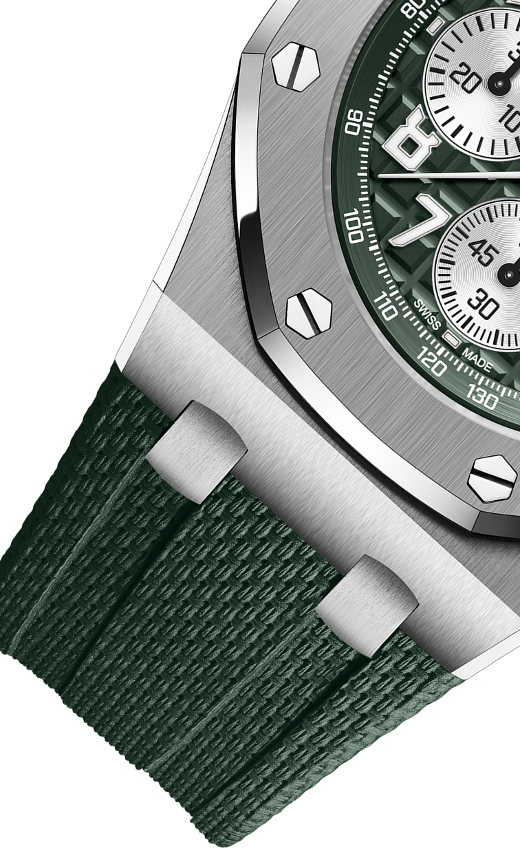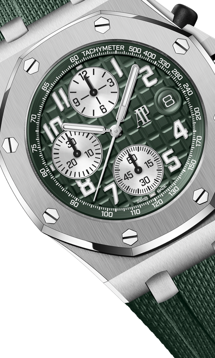 DIAL: Khaki green dial with “Mega Tapisserie” pattern, silver-toned counters, arabic numerals hour-markers and white gold Royal Oak hands with luminescent coating, khaki green inner bezel.