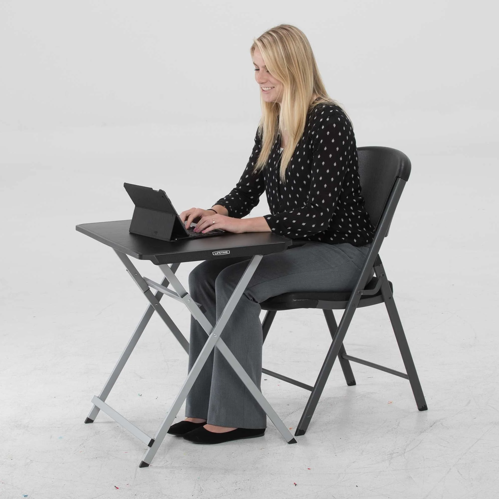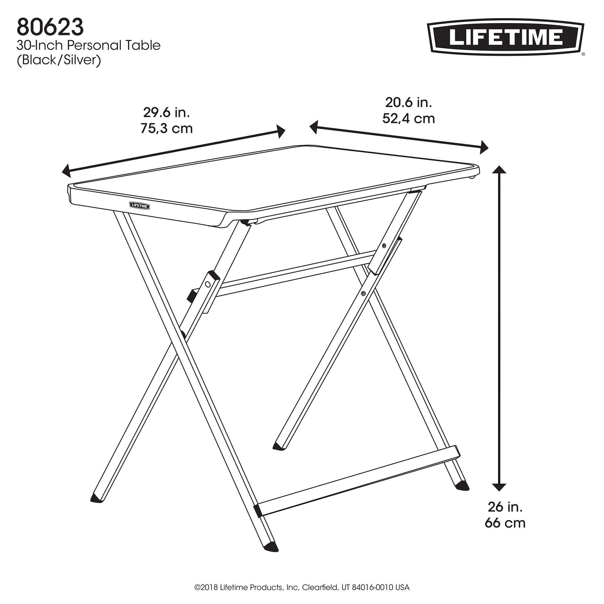 30-Inch Personal Tray Table - This is a black and silver personal folding table 30 in. X 20 in. with the X-frame and a rectangle top. Lifetime 30-Inch Personal Tables? are constructed of high-density polyethylene and designed for strength and stability. The wide-leg stance and brace position make the table the perfect desk height. The steel frame design folds flat for easy storage and is protected with a powder-coated£¬ weather-resistant finish. The modern style features thin edges£¬ rectangular tubing£¬ and a wide foot stance for ample legroom. The tables are built for indoor or outdoor use.