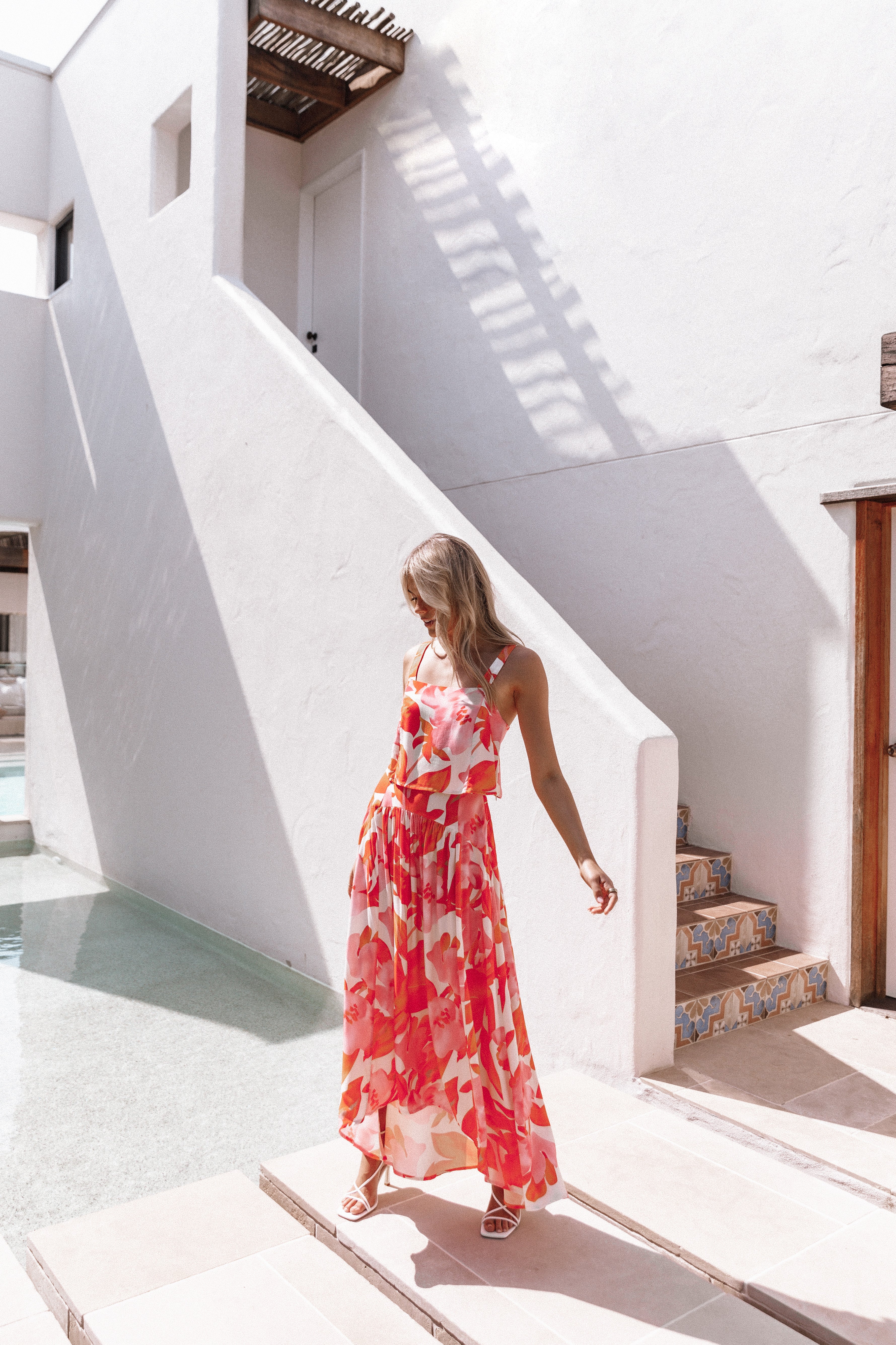| DETAILS Feel your most confident in this stylish crop and skirt set. Featuring a cropped length top with non adjustable straps, straight neckline, and side invisible zip for an easy fit. Complete the look with a high-low skirt featuring an elasticised waistband at back, side invisible zip, and oh-so stunning pink floral print.
