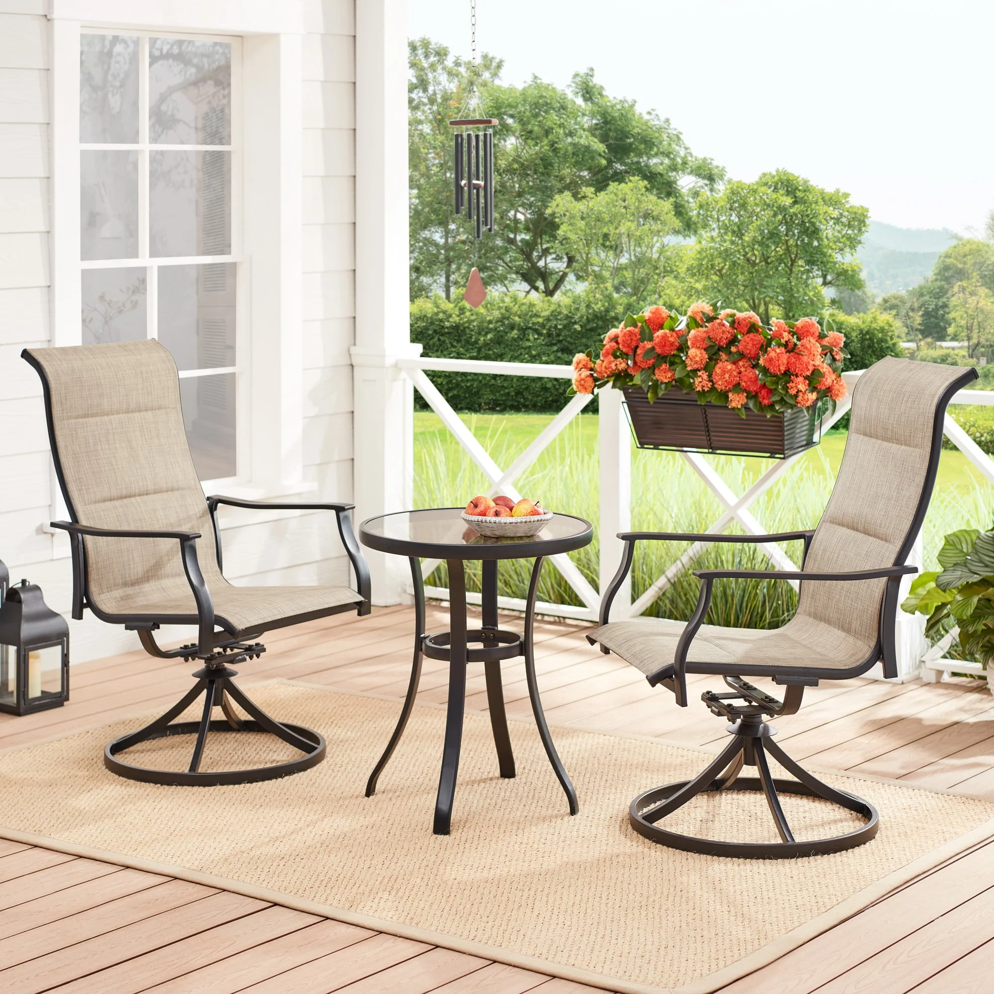 Creates a wonderful place to relax on your deck£¬ patio£¬ porch£¬ garden£¬ and other outdoor areas. With two swivel rocker chairs£¬ the set centers around a tempered glass top table crafted of sturdy steel with a powder-coated finish to resist corrosion. The Mainstays Highland Bistro Set is a great way to help transform your outdoor living or dining area and is just one part of the entire Mainstays Highland Knolls collection of outdoor furniture (other pieces sold separately).